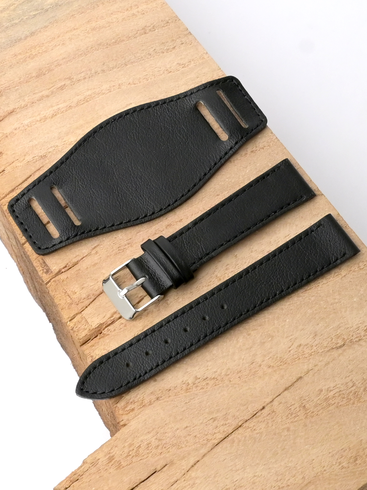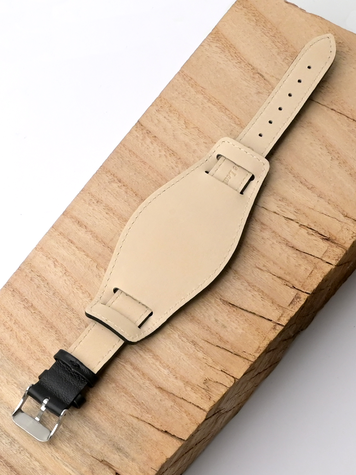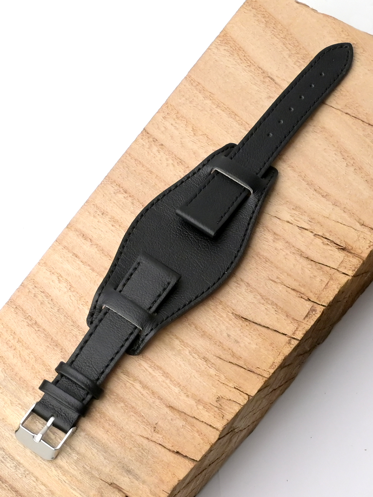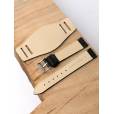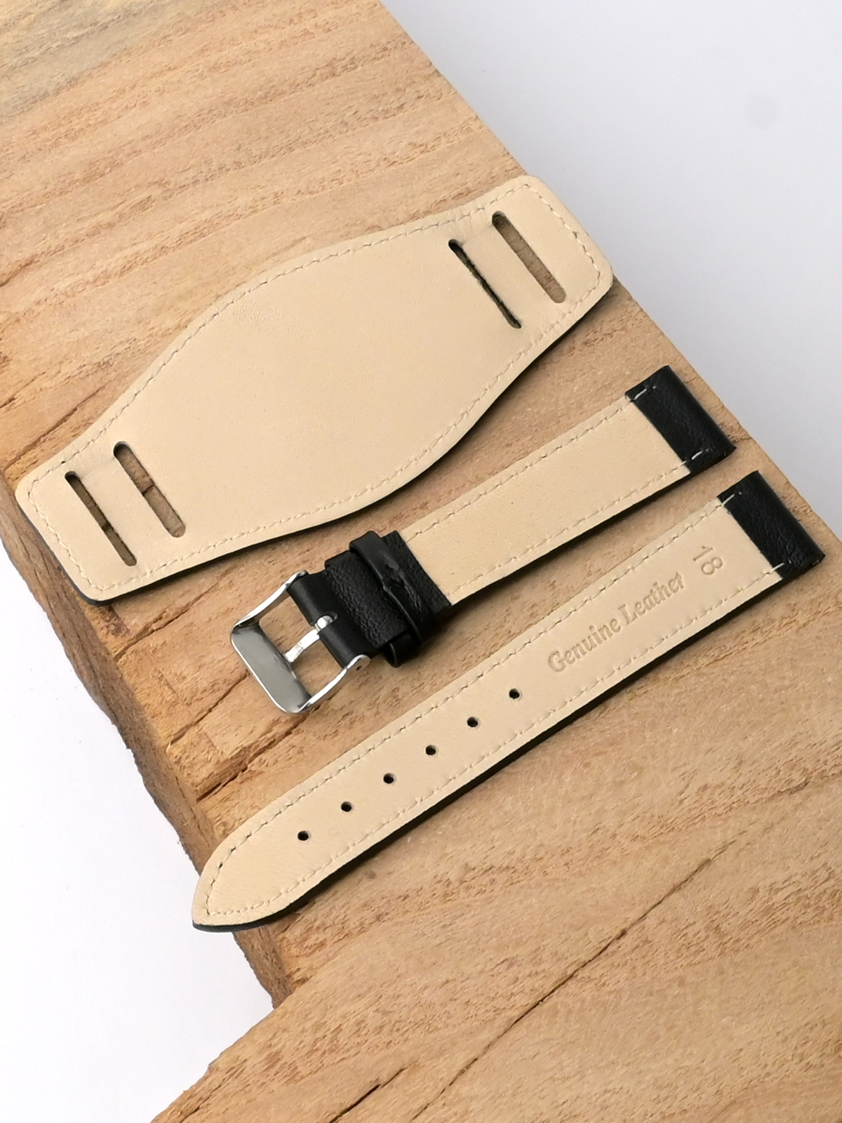 Ремешок из натуральной кожи для наручных часов с напульсником. Материал: высококачественная кожа теленка. Ширина крепления: 18 мм. Ширина пряжки: 16 мм. Длина большей части: 115 мм. Длина меньшей части без застежки: 75 мм. Ширина напульсника 45 мм, длина 100 мм. Пряжка из полированной нержавеющей стали.