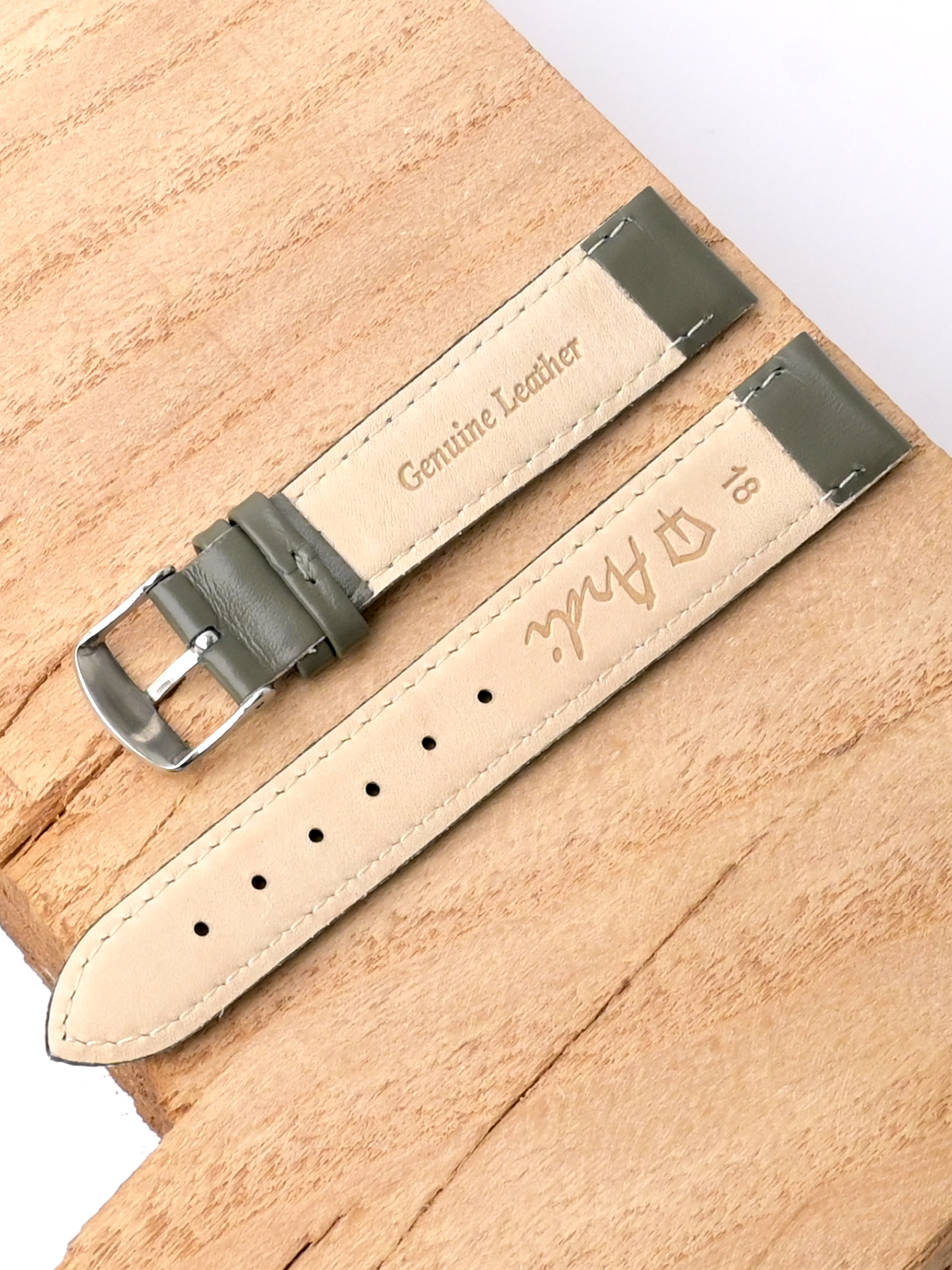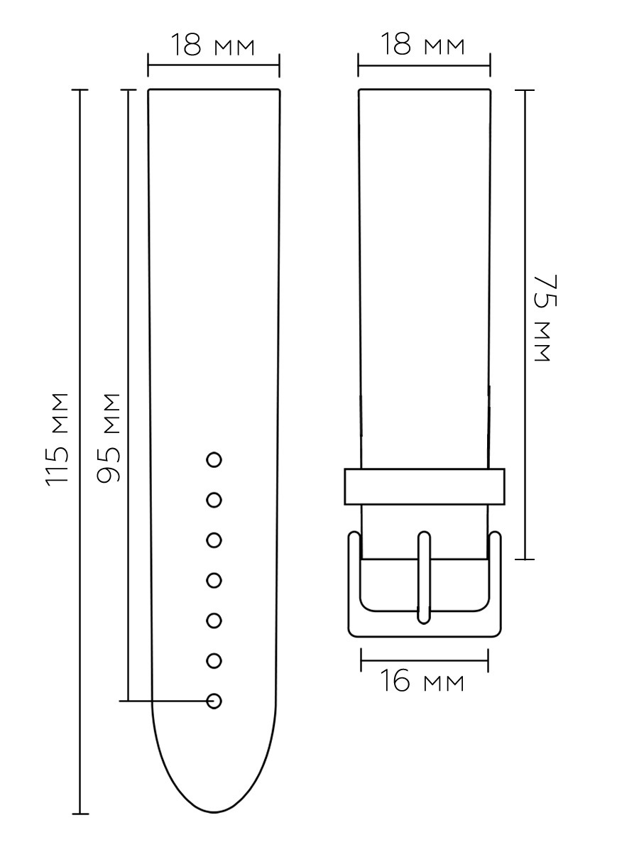 Ремешок из натуральной кожи для наручных часов. Материал: высококачественная кожа теленка. Ширина крепления: 18 мм. Ширина пряжки: 16 мм. Длина большей части: 115 мм. Длина меньшей части без застежки: 75 мм. Пряжка из полированной нержавеющей стали.