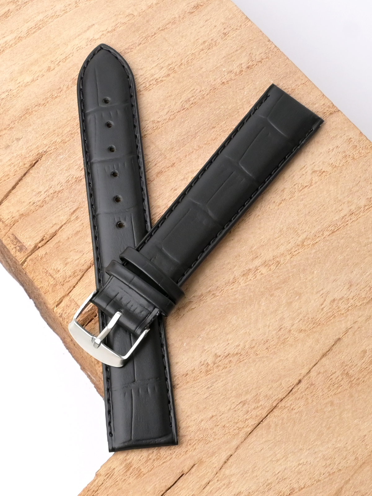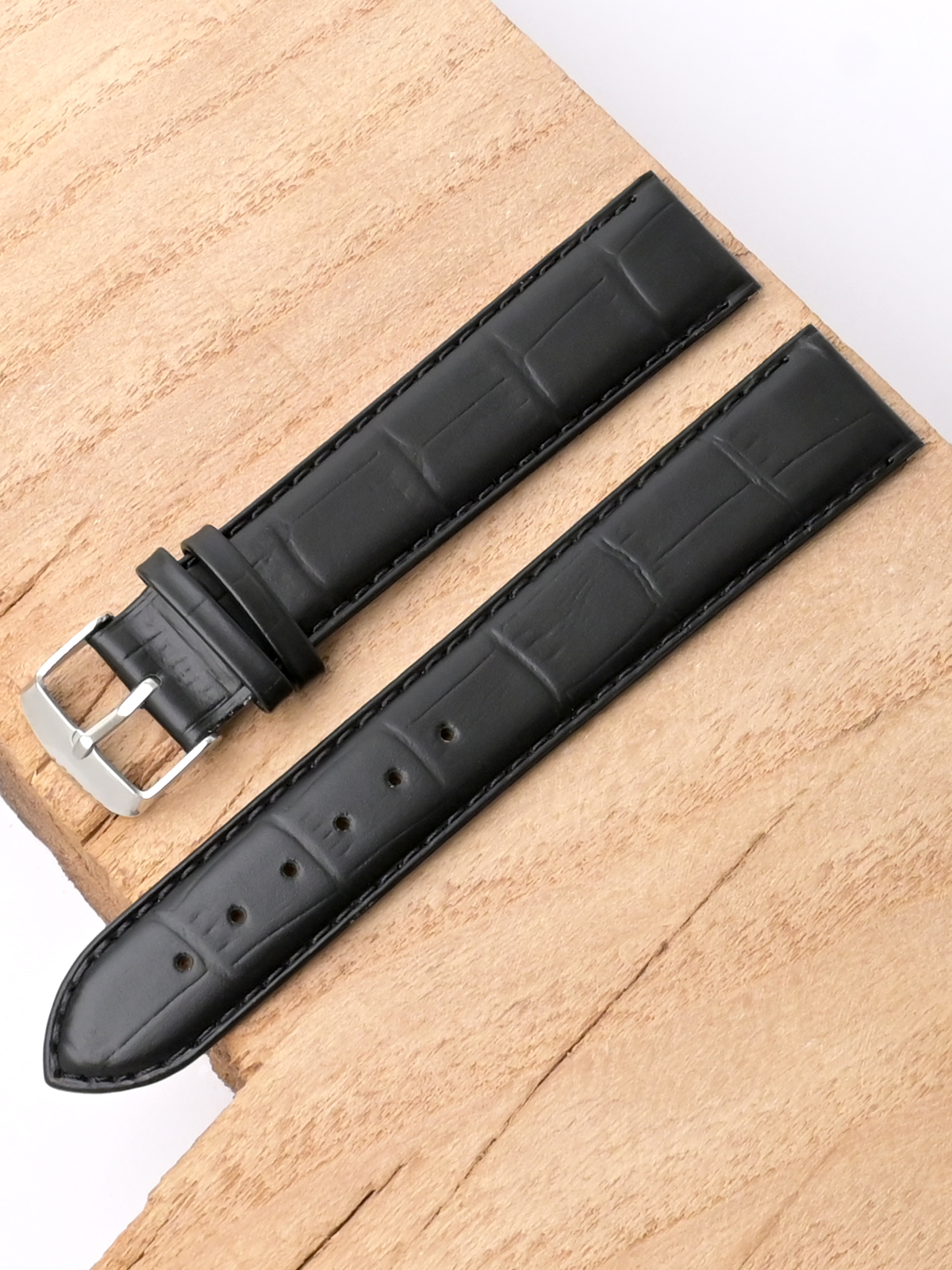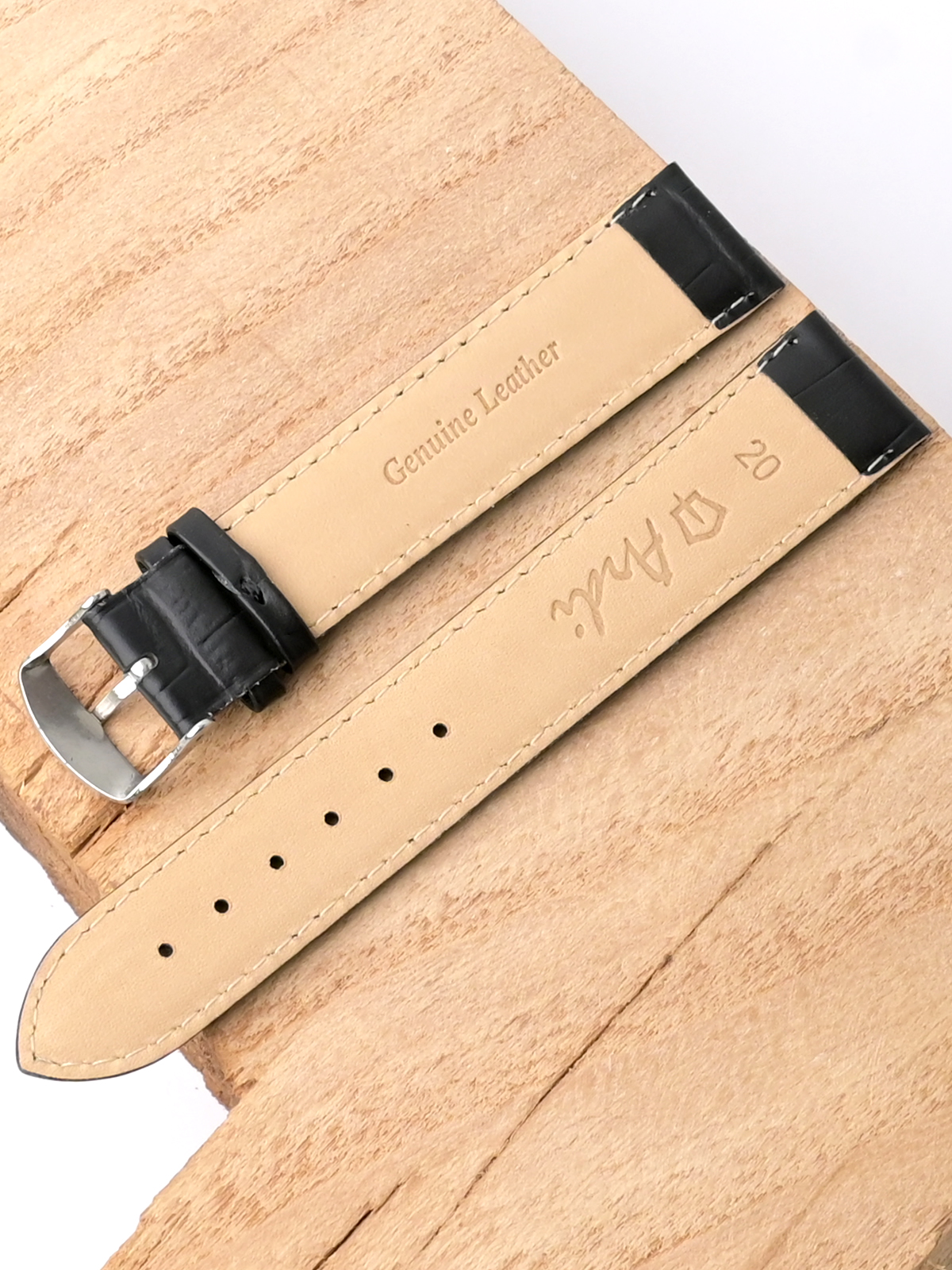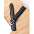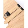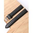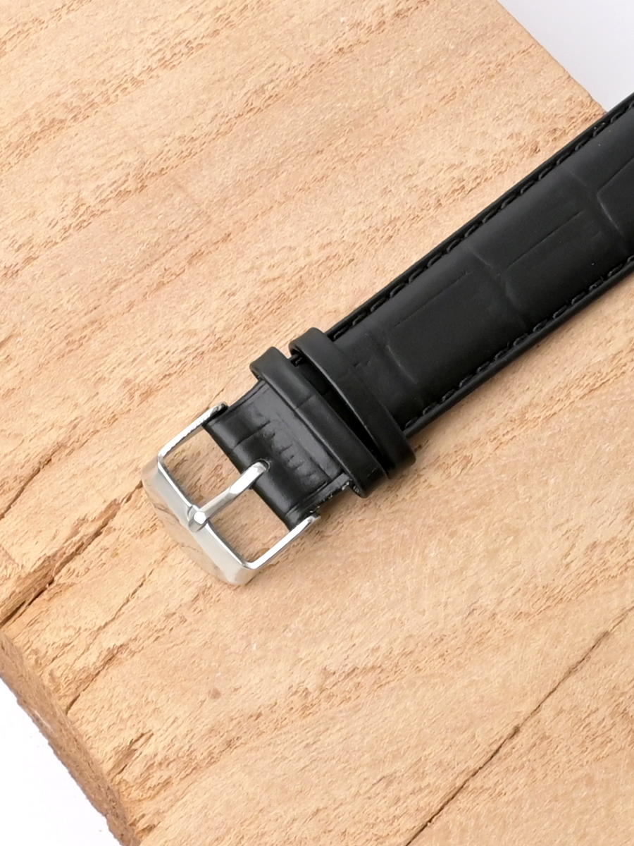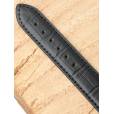 Ремешок из натуральной кожи черного цвета для наручных часов. Материал: высококачественная кожа теленка. Ширина крепления: 20 мм. Ширина пряжки: 18 мм. Длина большей части: 125 мм. Длина меньшей части без застежки: 90 мм. Пряжка выполнена из полированной нержавеющей стали.