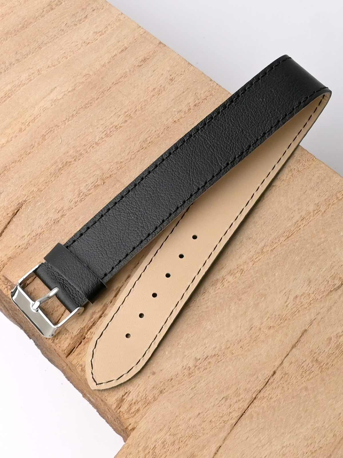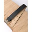 Сплошной ремешок из натуральной кожи черного цвета для наручных часов. Материал: высококачественная кожа теленка. Ширина ремешка на всем протяжении 20 мм. Ширина пряжки: 20 мм. Длина ремешка: 250 мм. Обхват запястья до 230 мм. Пряжка из полированной нержавеющей стали.