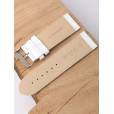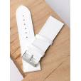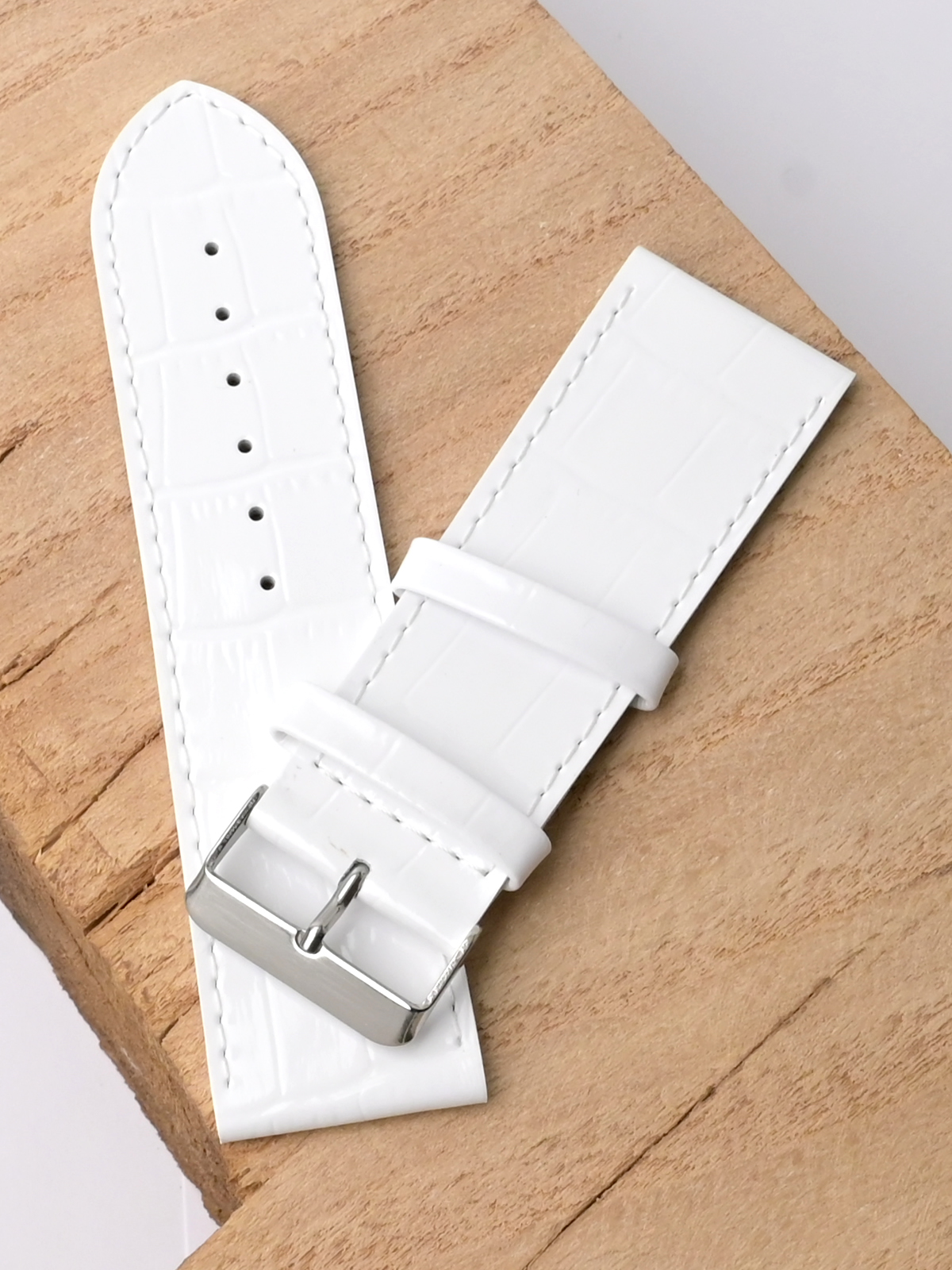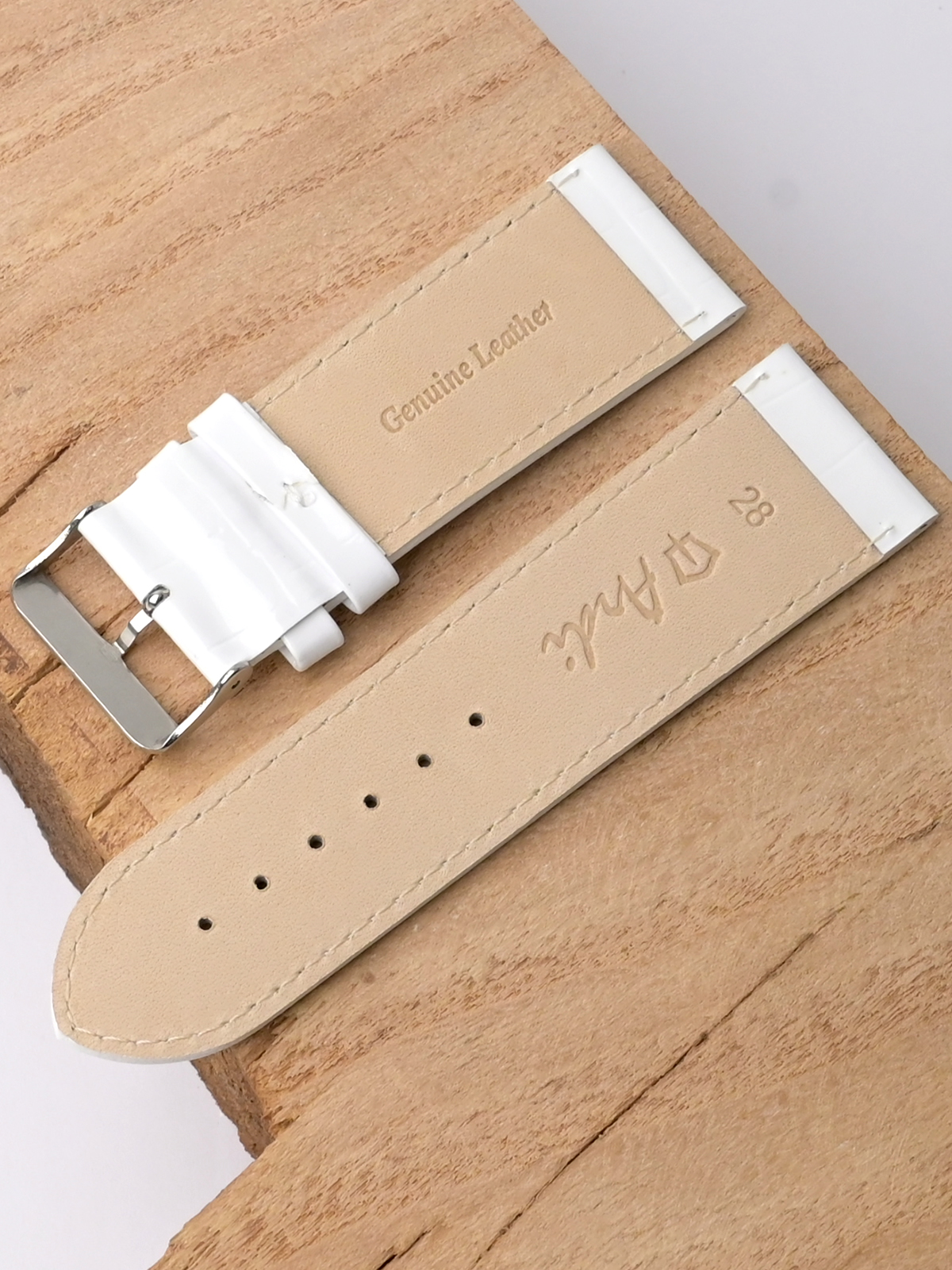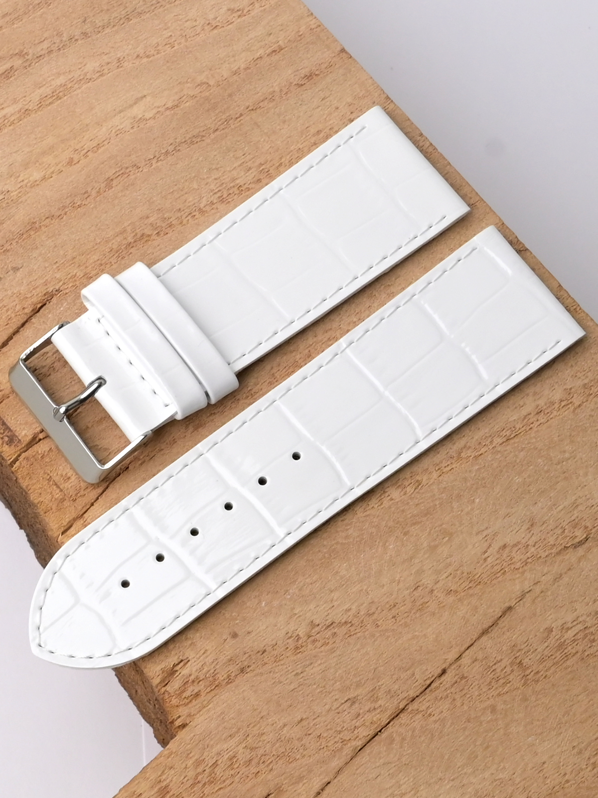Лакированный ремешок из натуральной кожи белого цвета для наручных часов. Материал: высококачественная кожа теленка. Ширина крепления: 28 мм. Ширина пряжки: 26 мм. Длина большей части: 120 мм. Длина меньшей части без застежки: 80 мм. Пряжка выполнена из полированной нержавеющей стали.