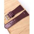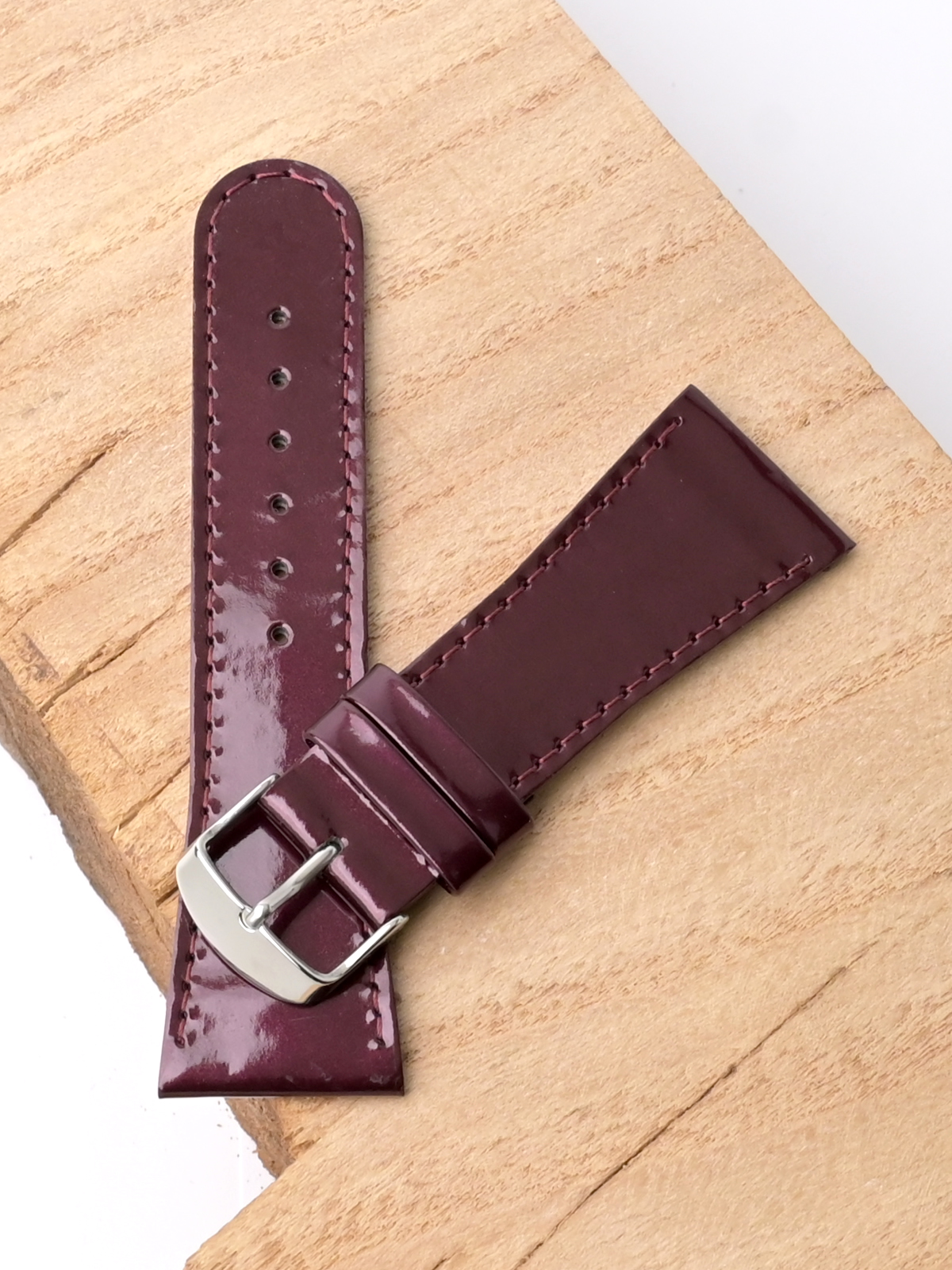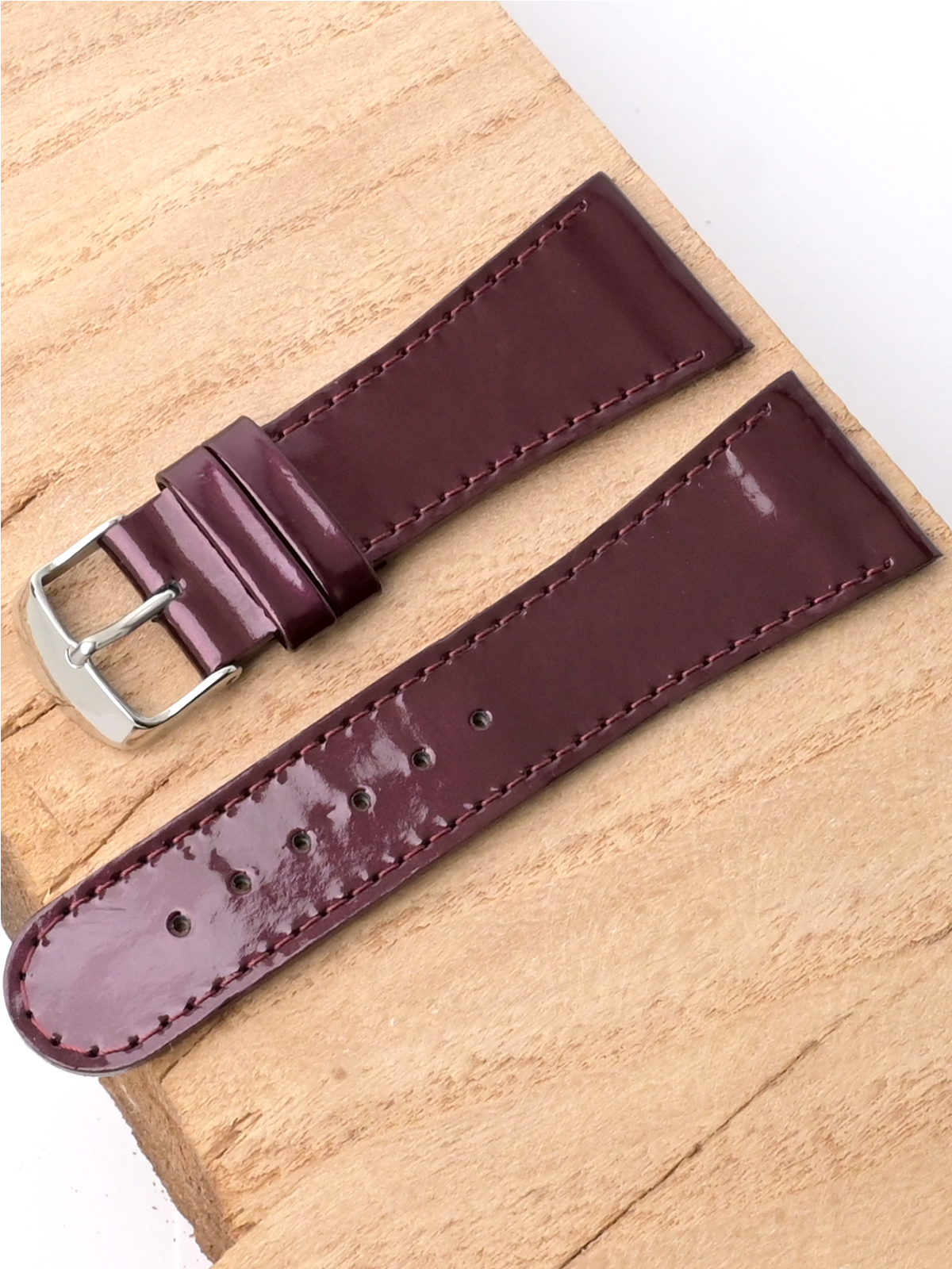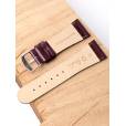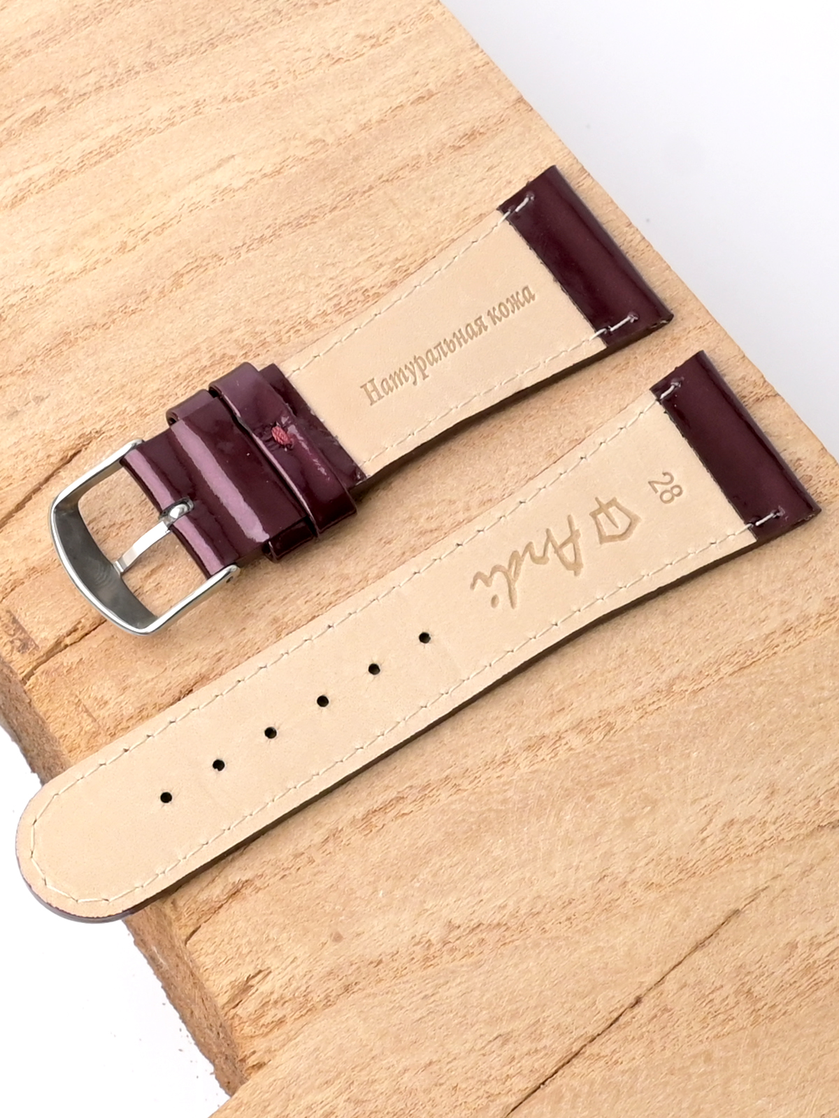 Лакированный ремешок из натуральной кожи сливового цвета для наручных часов. Материал: высококачественная кожа теленка. Ширина крепления: 28 мм. Ширина пряжки: 20 мм. Длина большей части: 115 мм. Длина меньшей части без застежки: 75 мм. Пряжка из полированной нержавеющей стали.
