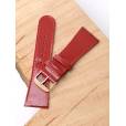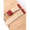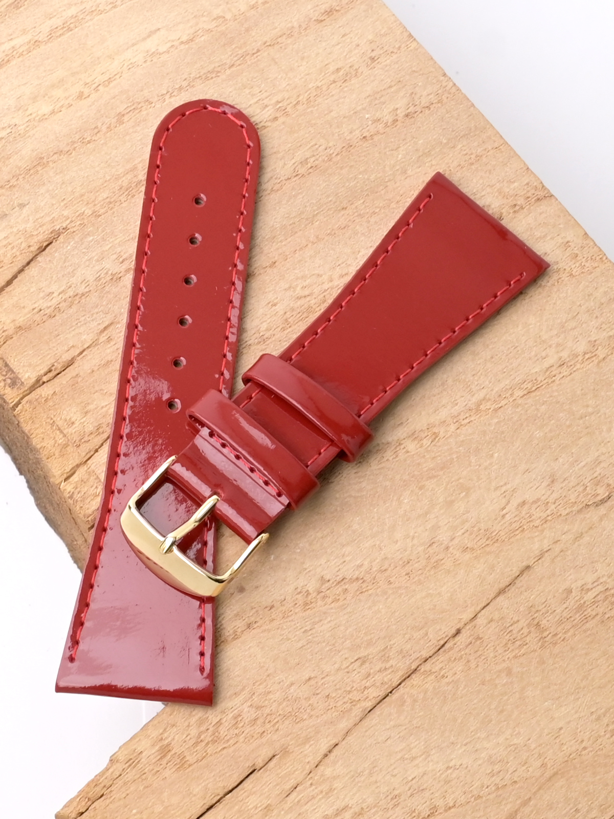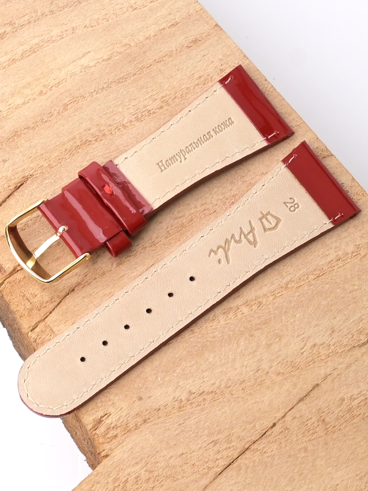 Лакированный ремешок из натуральной кожи красного цвета для наручных часов. Материал: высококачественная кожа теленка. Ширина крепления: 28 мм. Ширина пряжки: 20 мм. Длина большей части: 115 мм. Длина меньшей части без застежки: 80 мм. Пряжка из полированной стали с PVD покрытием цвета желтого золота.