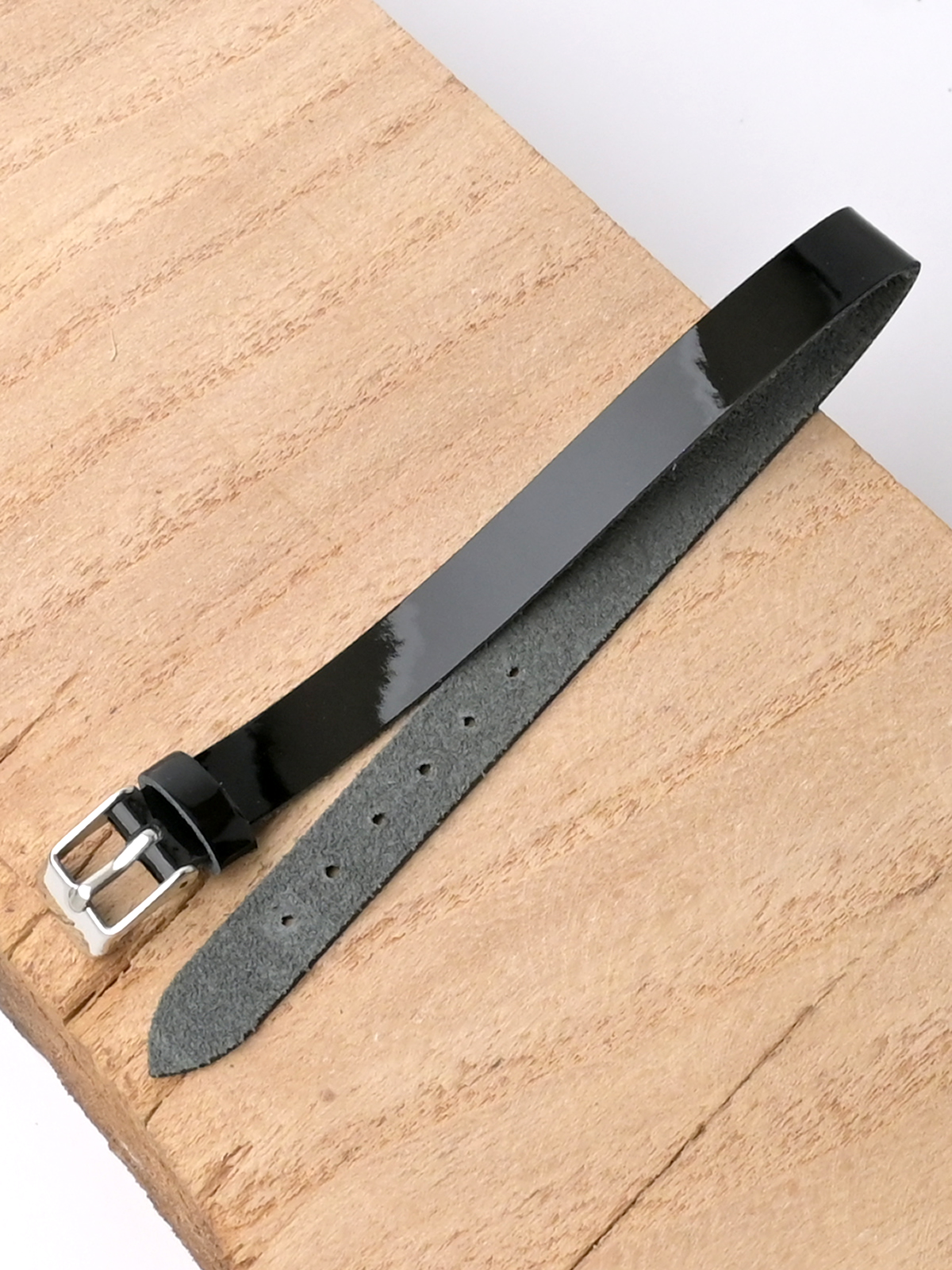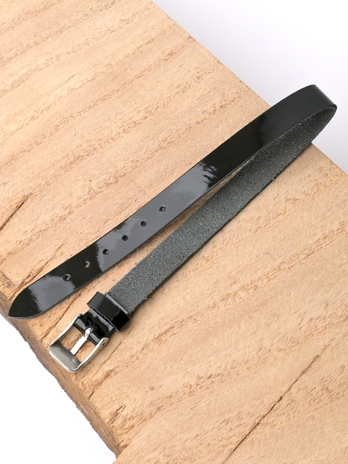 Сплошной ремешок из натуральной лакированной кожи для наручных часов. Материал: высококачественная кожа теленка. Ширина ремешка на всем протяжении 10 мм. Ширина пряжки: 10 мм. Длина ремешка: 235 мм. Обхват запястья до 215 мм. Пряжка из полированной нержавеющей стали.