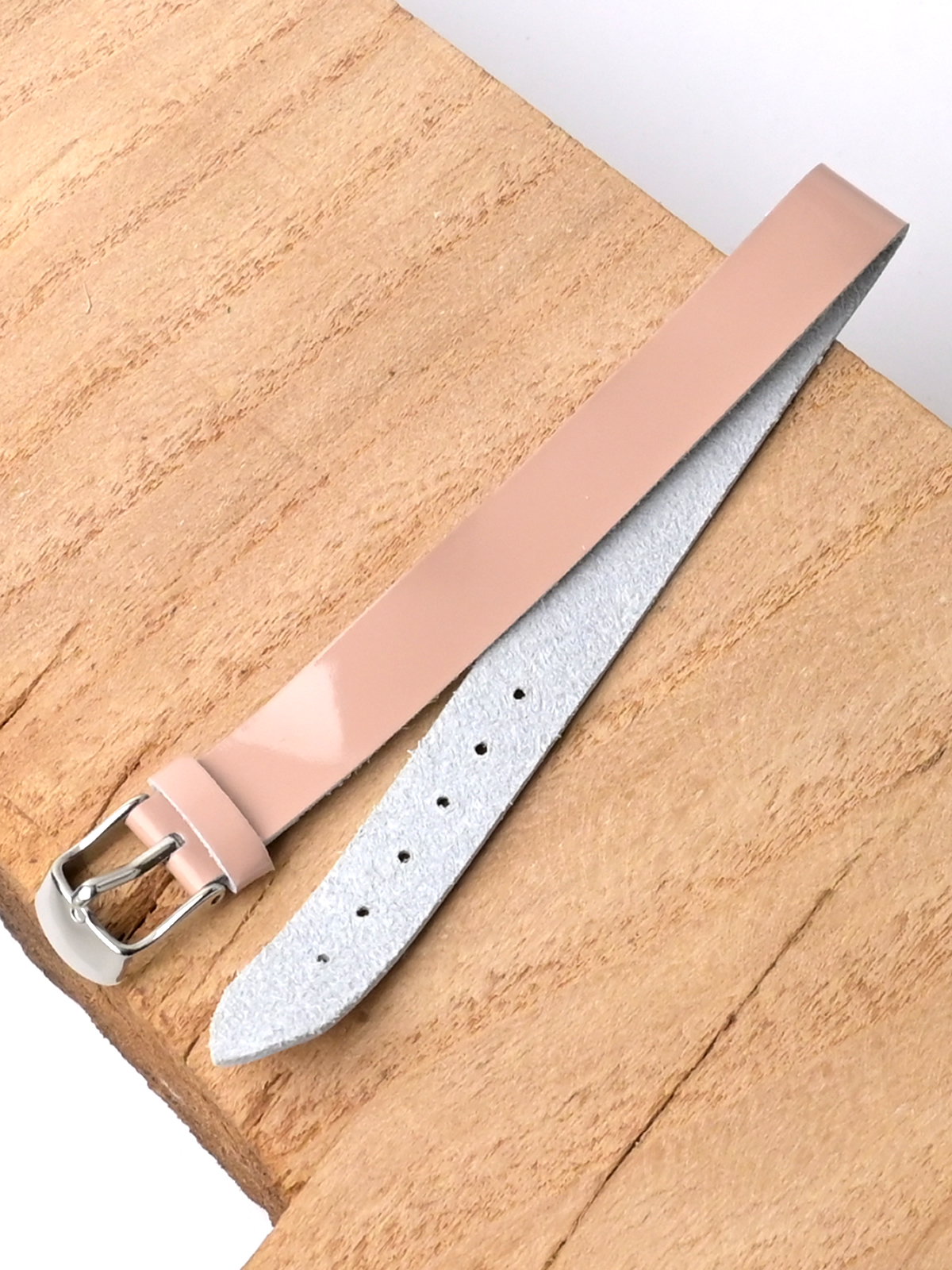Сплошной ремешок из натуральной лакированной кожи для наручных часов. Материал: высококачественная кожа теленка. Ширина ремешка на всем протяжении 12 мм. Ширина пряжки: 12 мм. Длина ремешка: 240 мм. Обхват запястья до 220 мм. Пряжка из полированной нержавеющей стали.