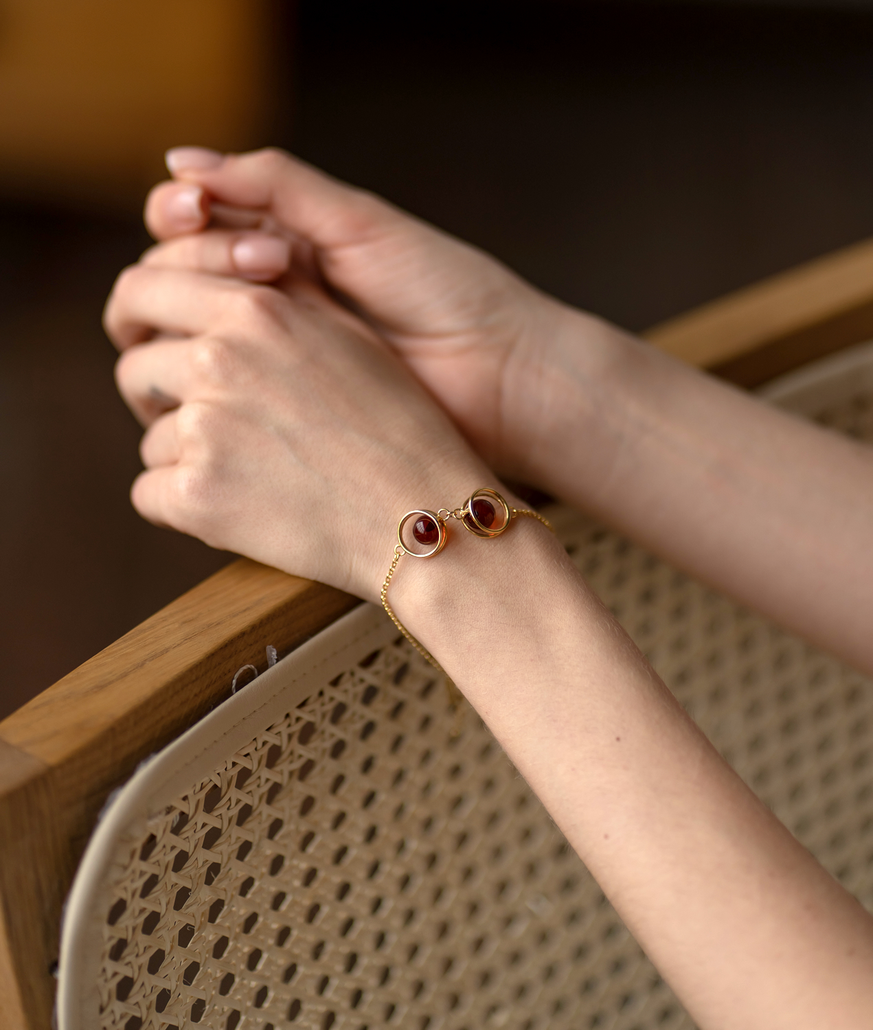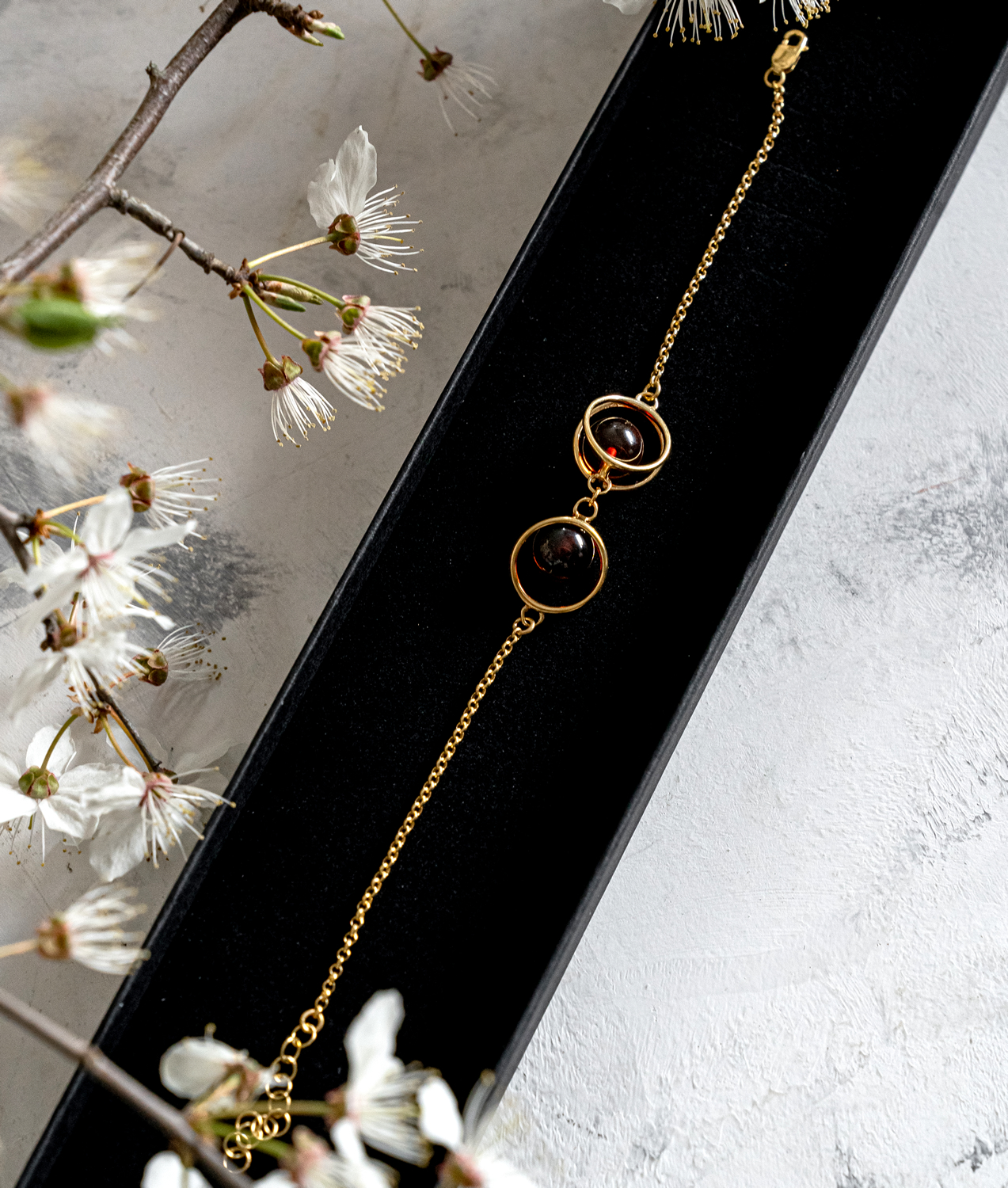 Дизайнерский браслет из золоченого серебра 925 пробы, дополнен вставками из натурального янтаря. Длина 14 см. + 5 см. (доп. звенья).