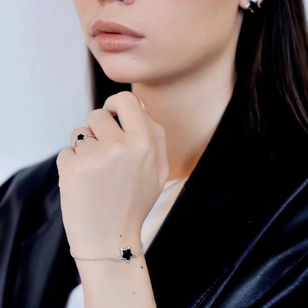 Современный браслет из серебра 925 пробы с родированием, дополнен вставкой в виде звездочки, выполненной из натурального янтаря. Длина 14 см + 5 см (доп. звенья).
