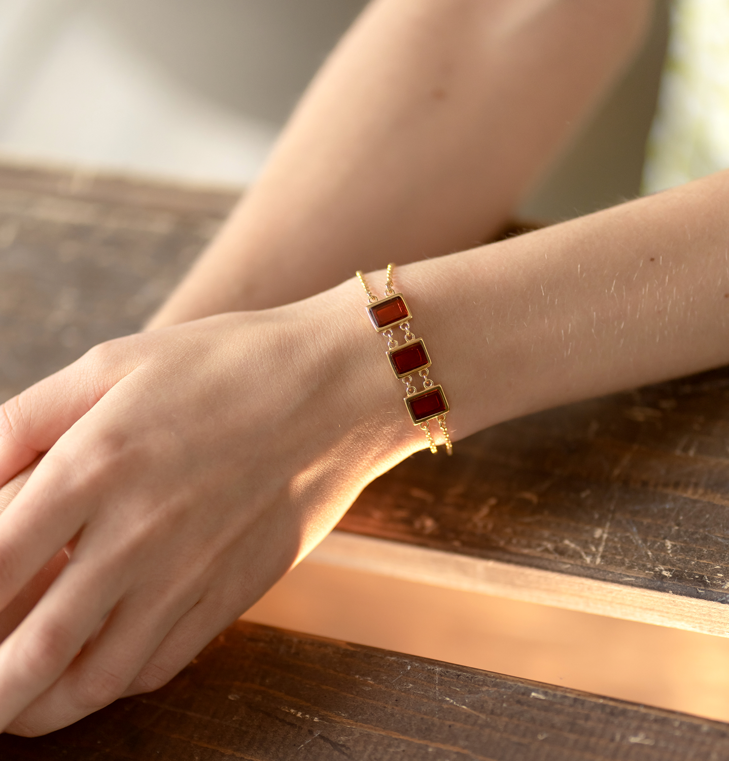 Минималистичный браслет от Sun Stone из золоченого серебра 925 пробы. Дополнен вставками из натурального янтаря. Длина 15 см + 5 см (доп. звенья).