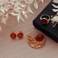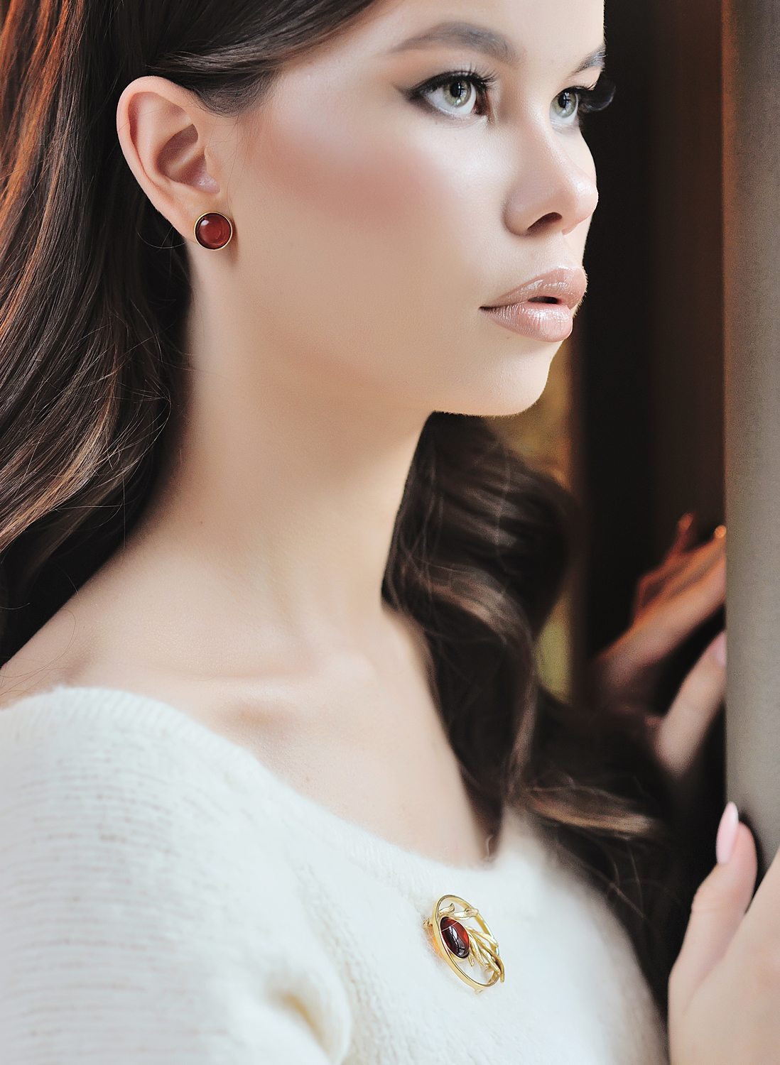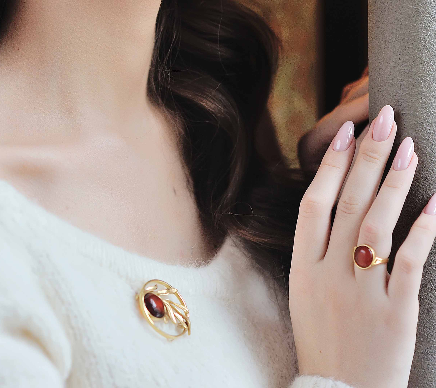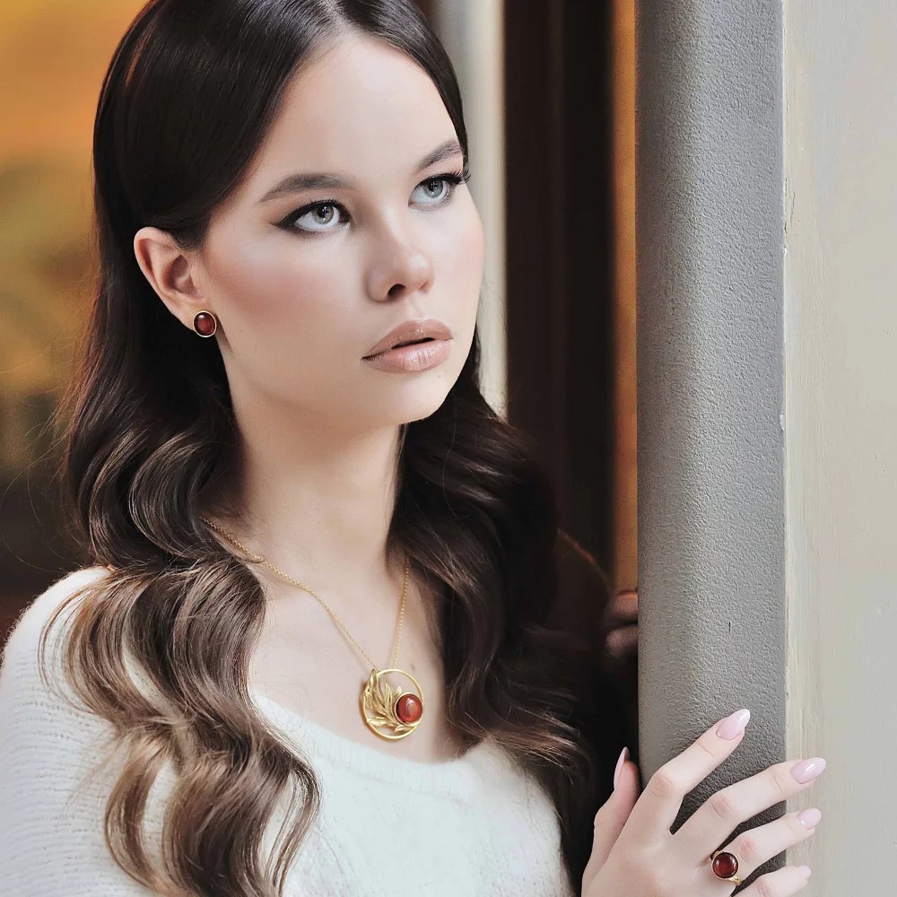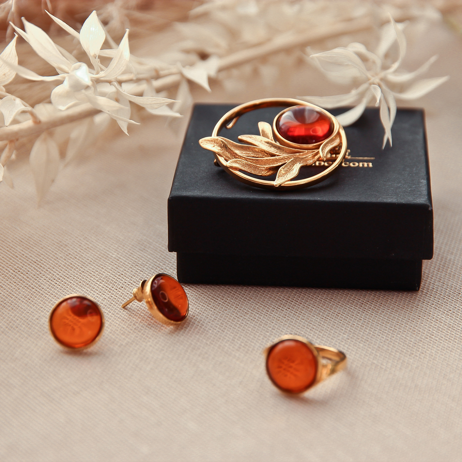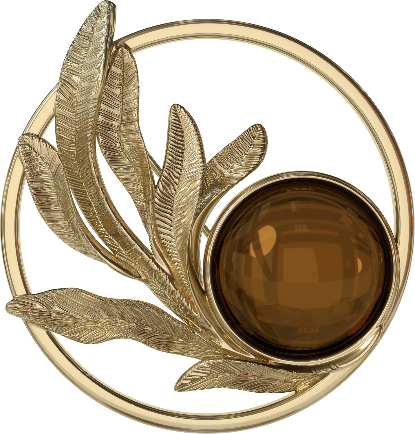 Современная брошь-кулон из золоченого серебра 925 пробы с натуральным янтарем.