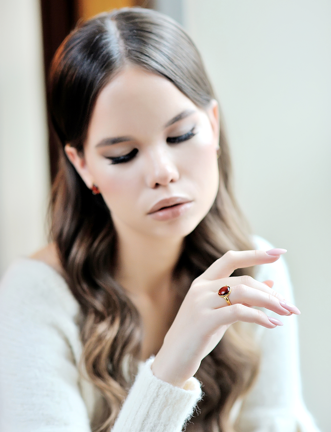 Дизайнерское кольцо из золоченого серебра 925 пробы с натуральным янтарем.
