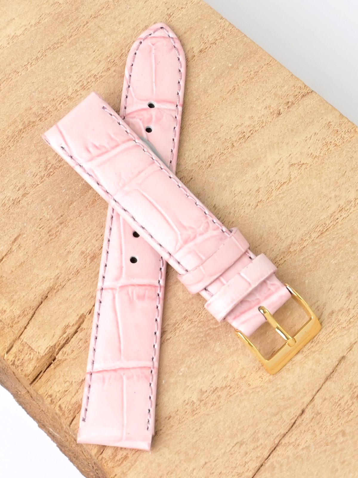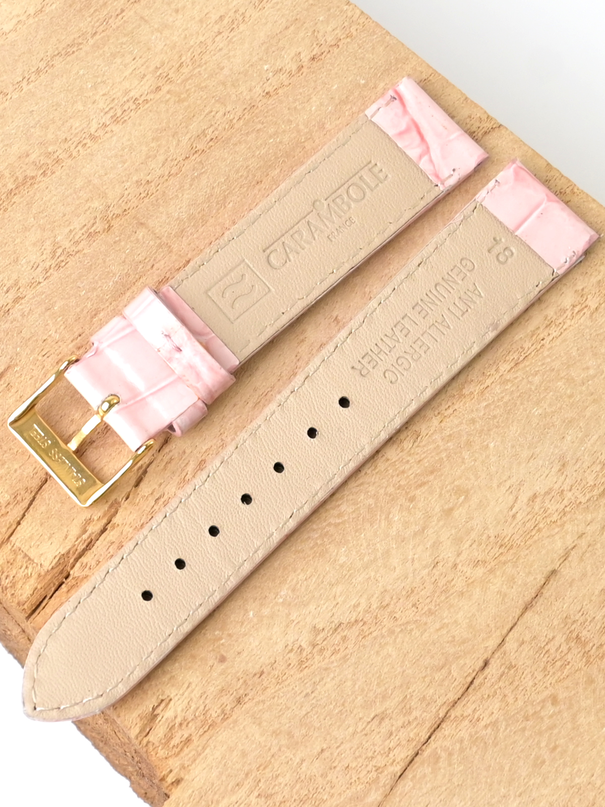 Ремешок из натуральной кожи для наручных часов. Ширина крепления: 18 мм. Ширина пряжки: 16 мм. Длина большей части: 115 мм. Длина меньшей части без застежки: 75 мм. Пряжка выполнена из нержавеющей стали с PVD покрытием цвета желтого золота.
