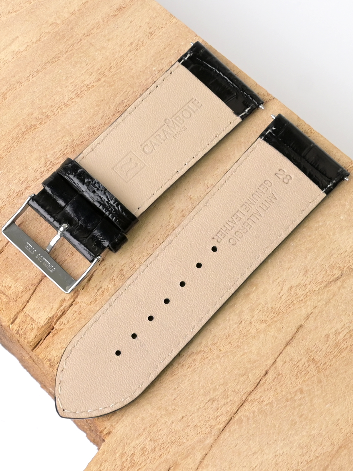 Ремешок из натуральной кожи для наручных часов. Ширина крепления: 28 мм. Ширина пряжки: 26 мм. Длина большей части: 115 мм. Длина меньшей части без застежки: 75 мм. Пряжка выполнена из нержавеющей стали/