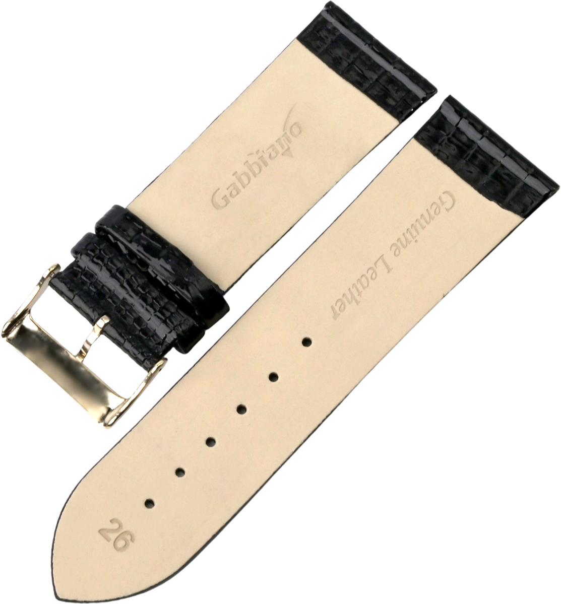 Ремешок Gabbiano для наручных часов, изготовленный из высококачественной натуральной кожи. Ширина крепления: 26 мм. Ширина пряжки: 24 мм. Длина большей части: 115 мм. Длина меньшей части без застежки: 75 мм. Пряжка из полированной стали с покрытием цвета желтого золота.