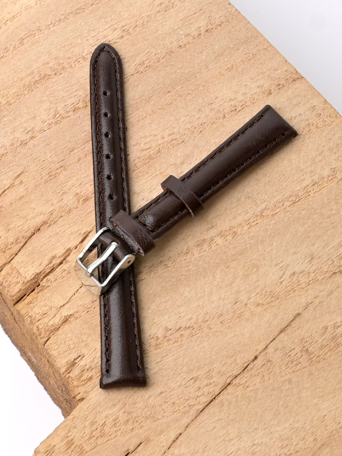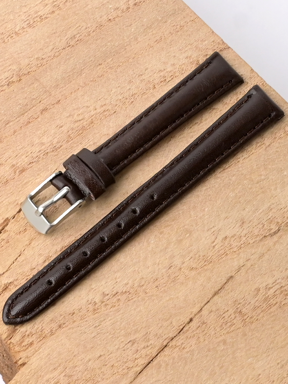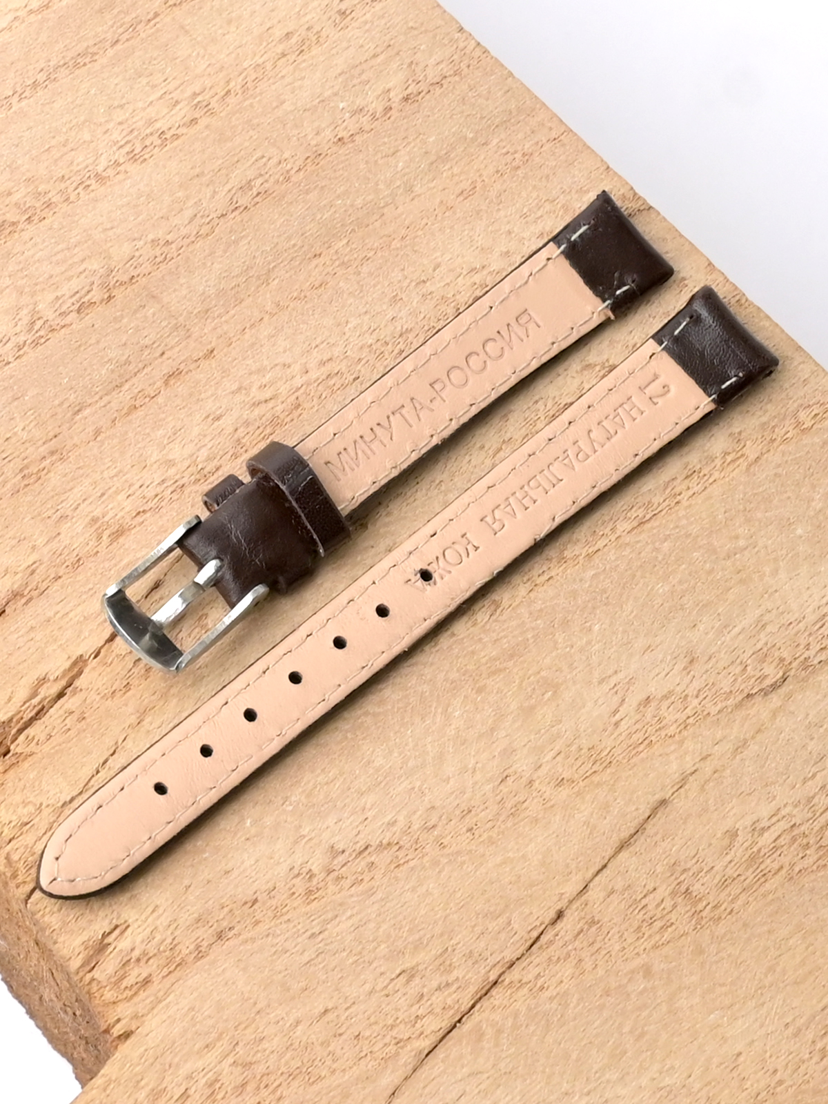 Ремешок из натуральной кожи для наручных часов. Ширина крепления: 12 мм. Ширина пряжки: 10 мм. Длина большей части: 105 мм. Длина меньшей части без застежки: 65 мм. Пряжка выполнена из нержавеющей стали.