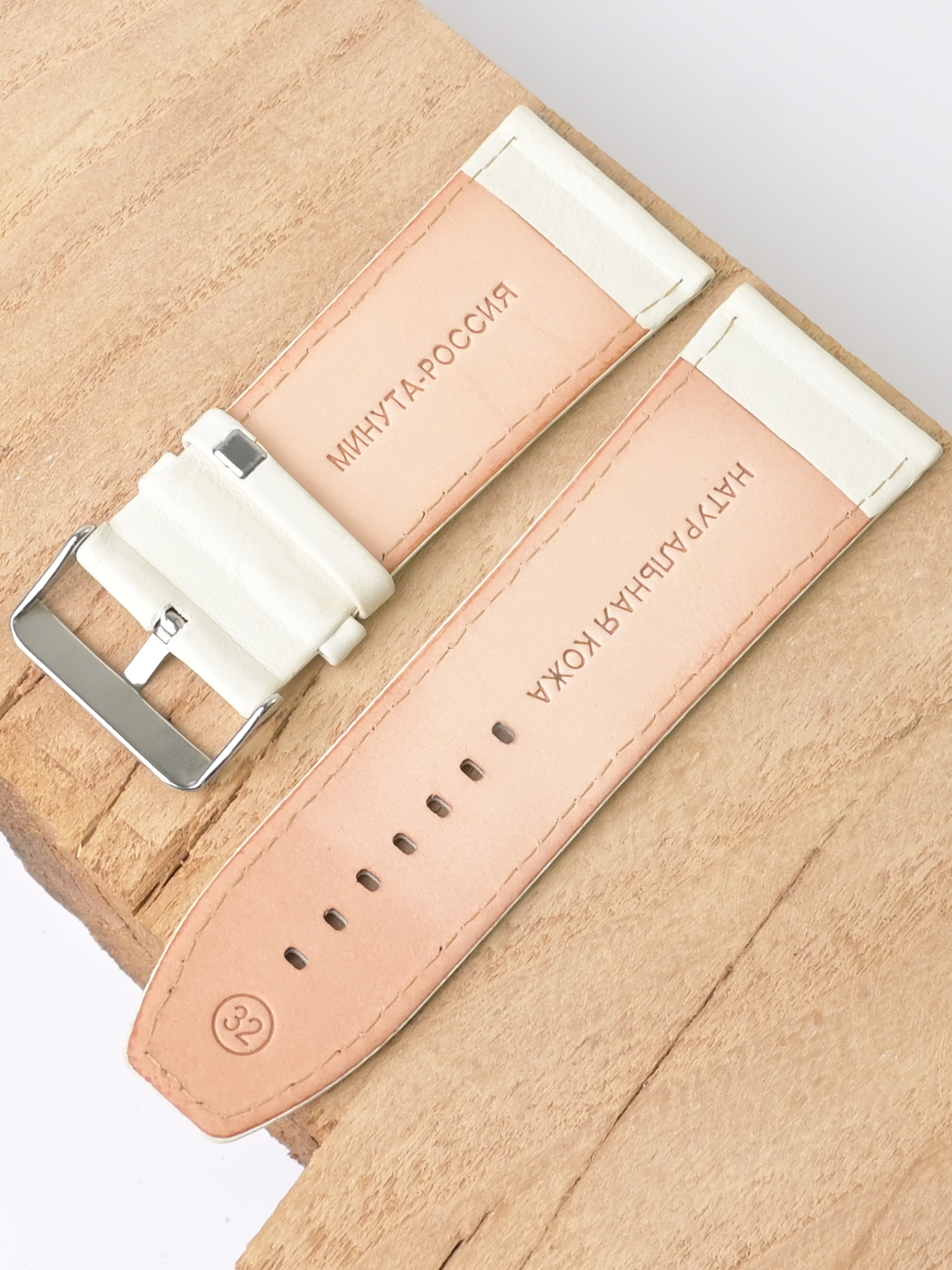 Ремешок из натуральной кожи для наручных часов. Ширина крепления: 32 мм. Ширина пряжки: 28 мм. Длина большей части: 120 мм. Длина меньшей части без застежки: 80 мм. Пряжка выполнена из нержавеющей стали.