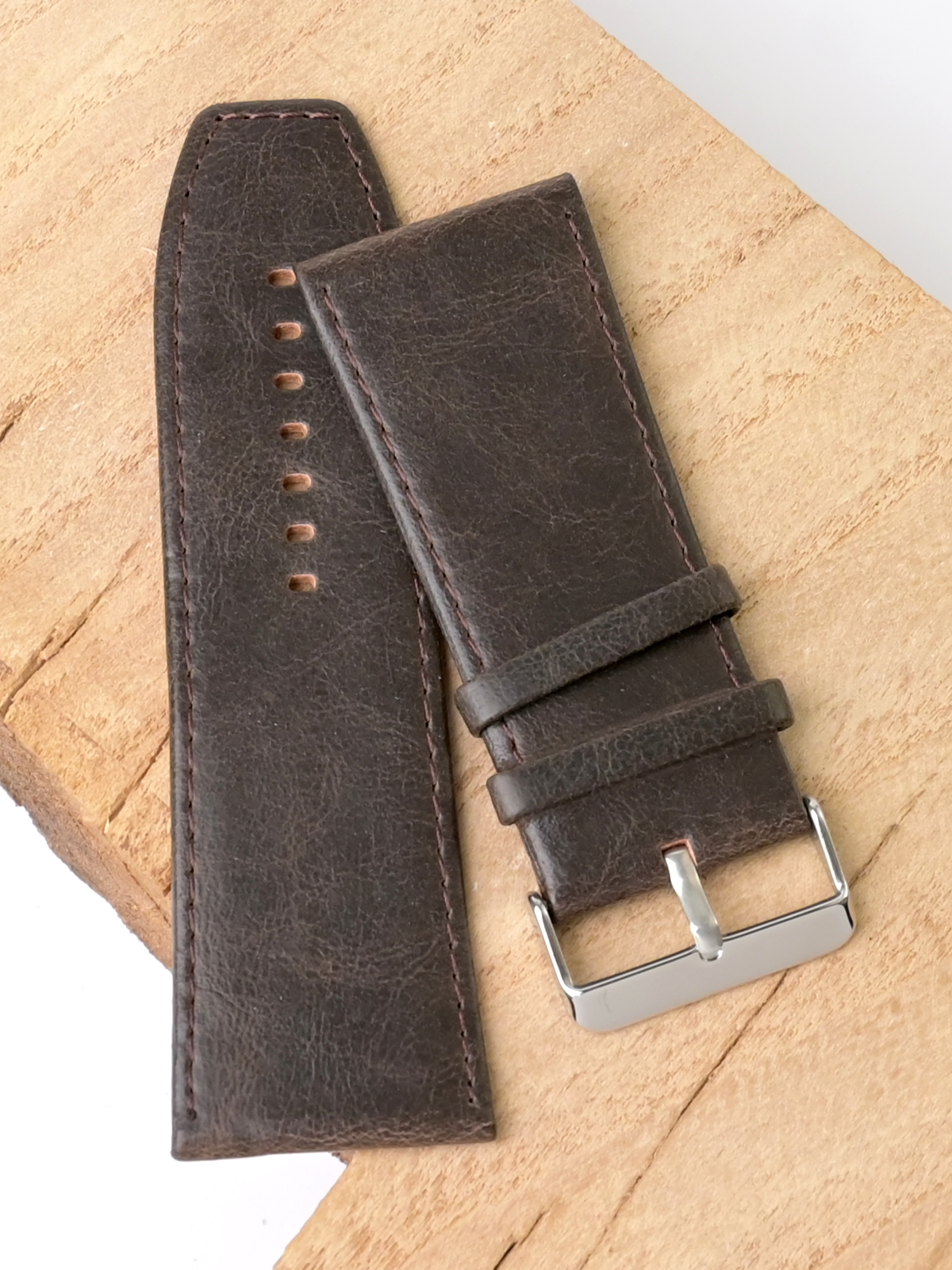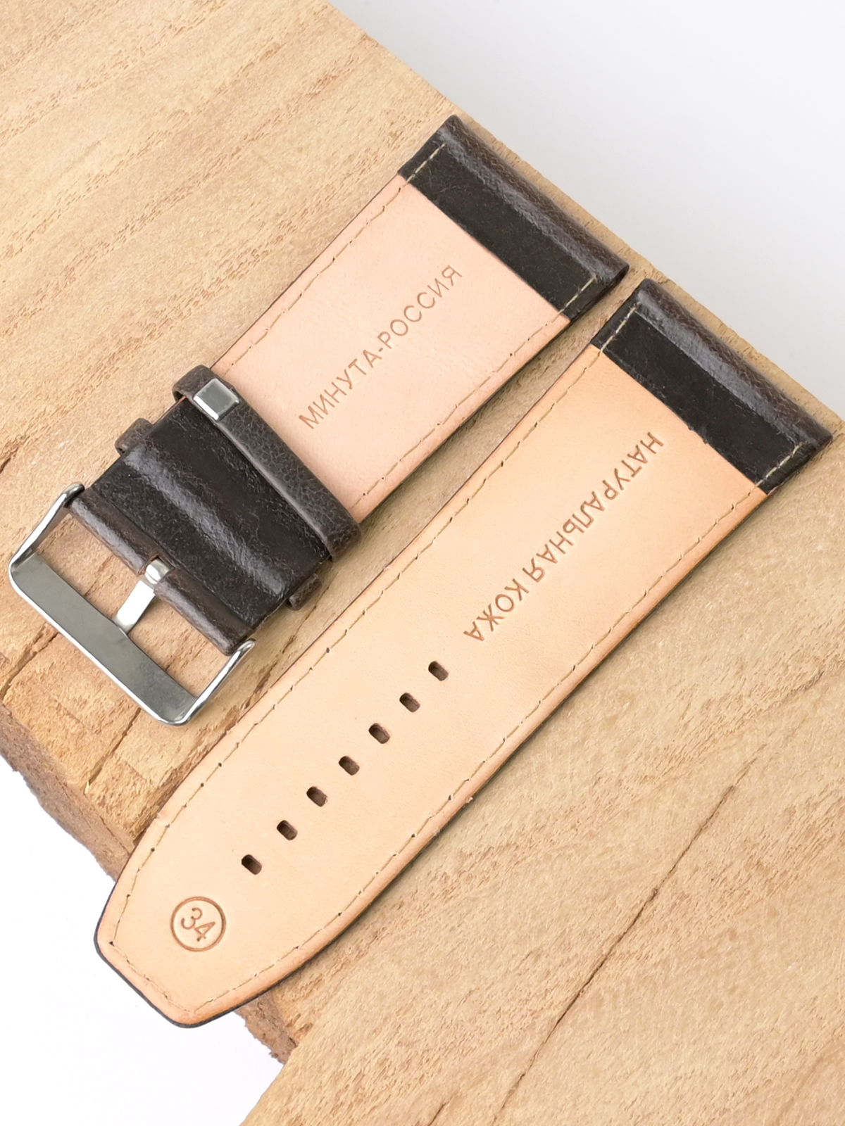 Ремешок из натуральной кожи для наручных часов. Ширина крепления: 34 мм. Ширина пряжки: 30 мм. Длина большей части: 120 мм. Длина меньшей части без застежки: 80 мм. Пряжка выполнена из нержавеющей стали.