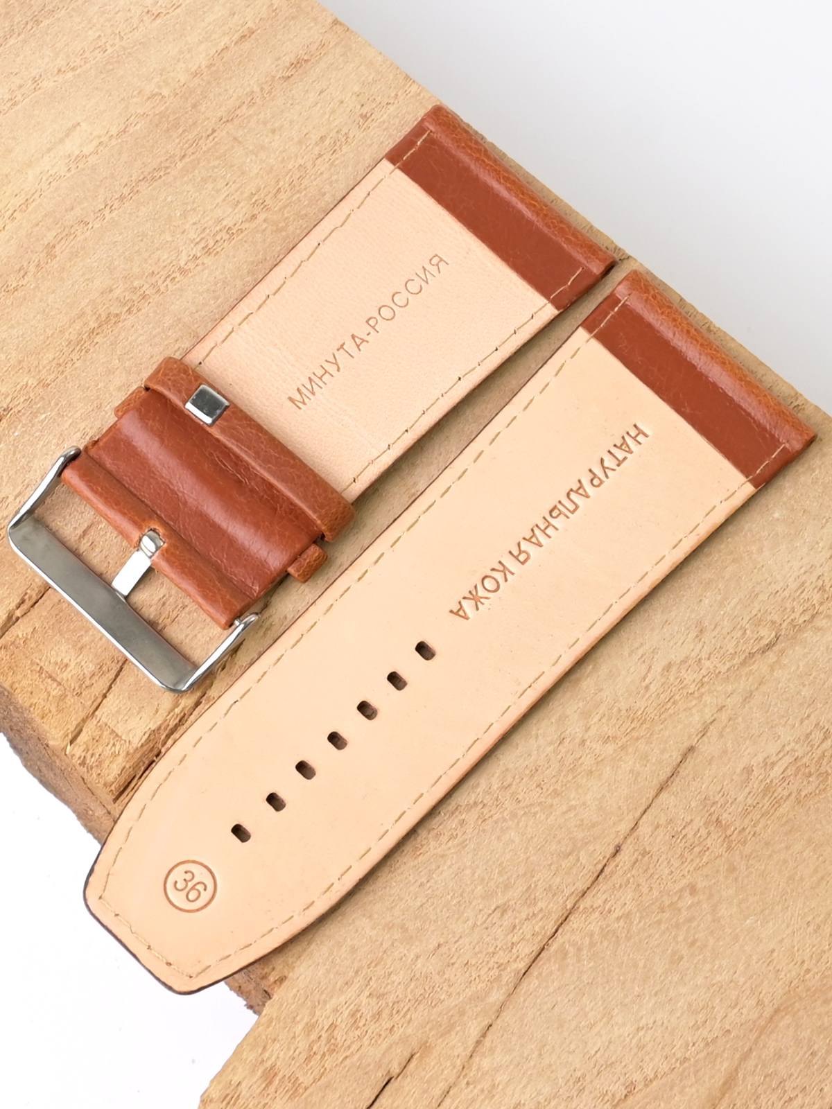 Ремешок из натуральной кожи для наручных часов. Ширина крепления: 36 мм. Ширина пряжки: 32 мм. Длина большей части: 120 мм. Длина меньшей части без застежки: 80 мм. Пряжка выполнена из нержавеющей стали.