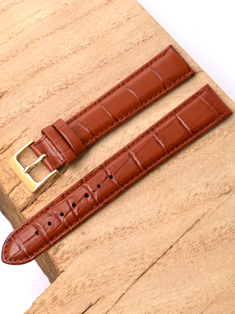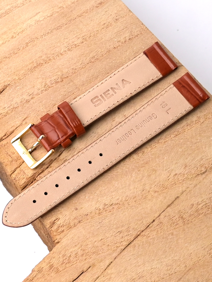 Ремешок Siena из натуральной кожи для наручных часов. Ширина крепления: 18 мм. Ширина пряжки: 16 мм. Длина большей части: 125 мм. Длина меньшей части без застежки: 85 мм. Пряжка выполнена из алюминия с покрытием цвета желтого золота.