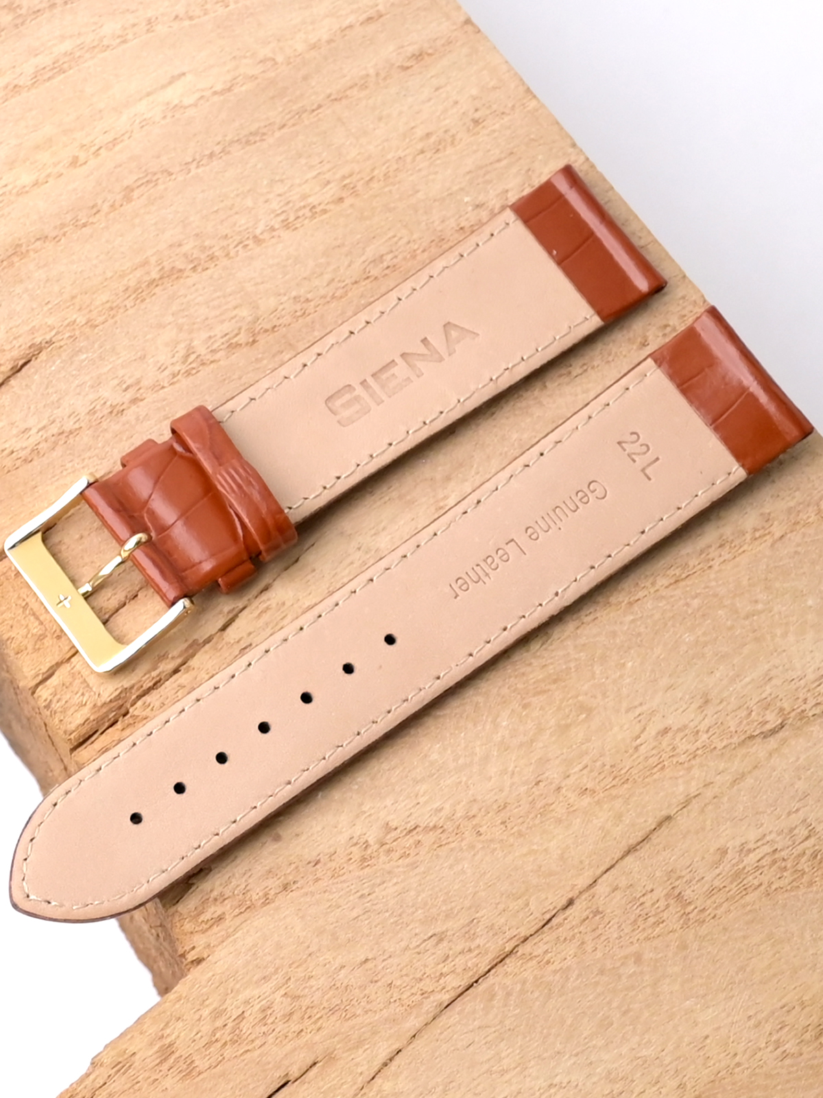 Ремешок Siena из натуральной кожи для наручных часов. Ширина крепления: 22 мм. Ширина пряжки: 20 мм. Длина большей части: 125 мм. Длина меньшей части без застежки: 85 мм. Пряжка выполнена из алюминия с покрытием цвета желтого золота.
