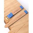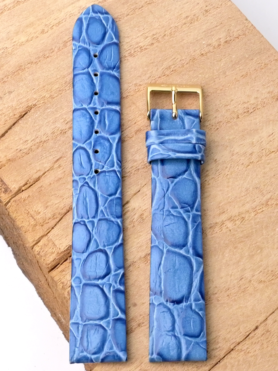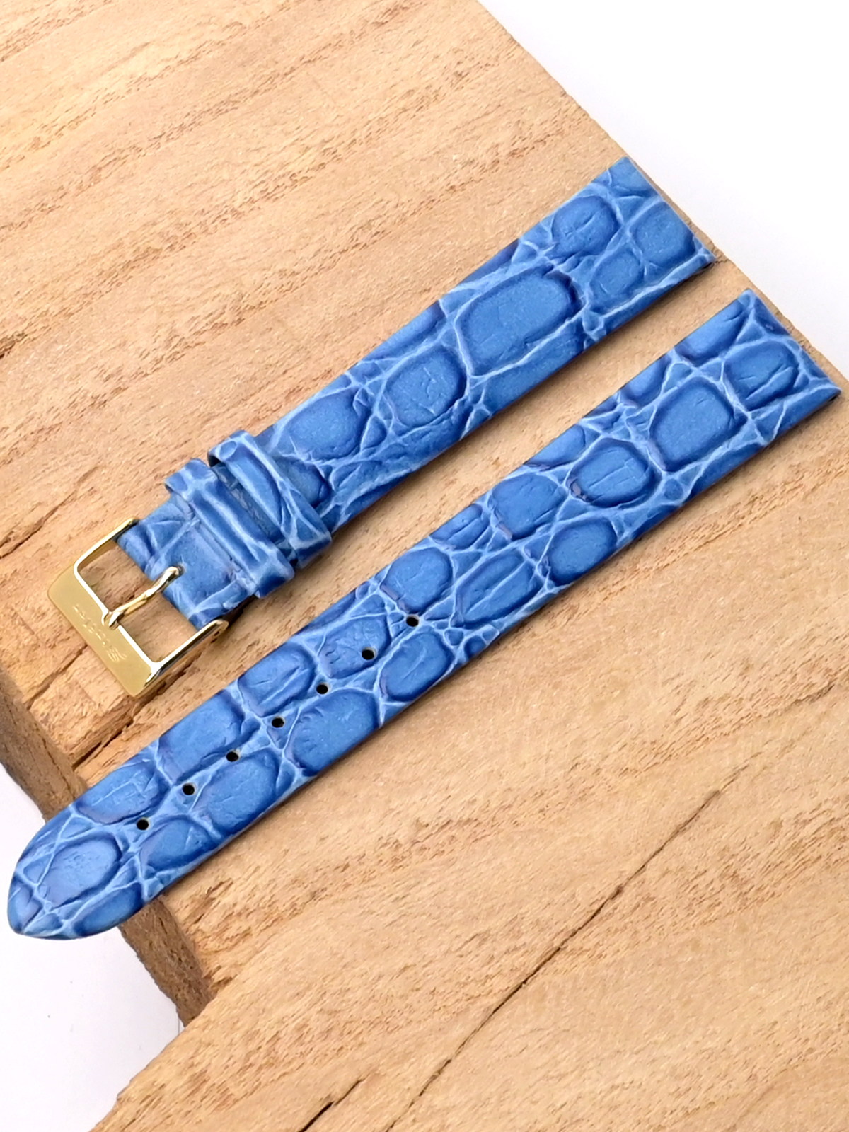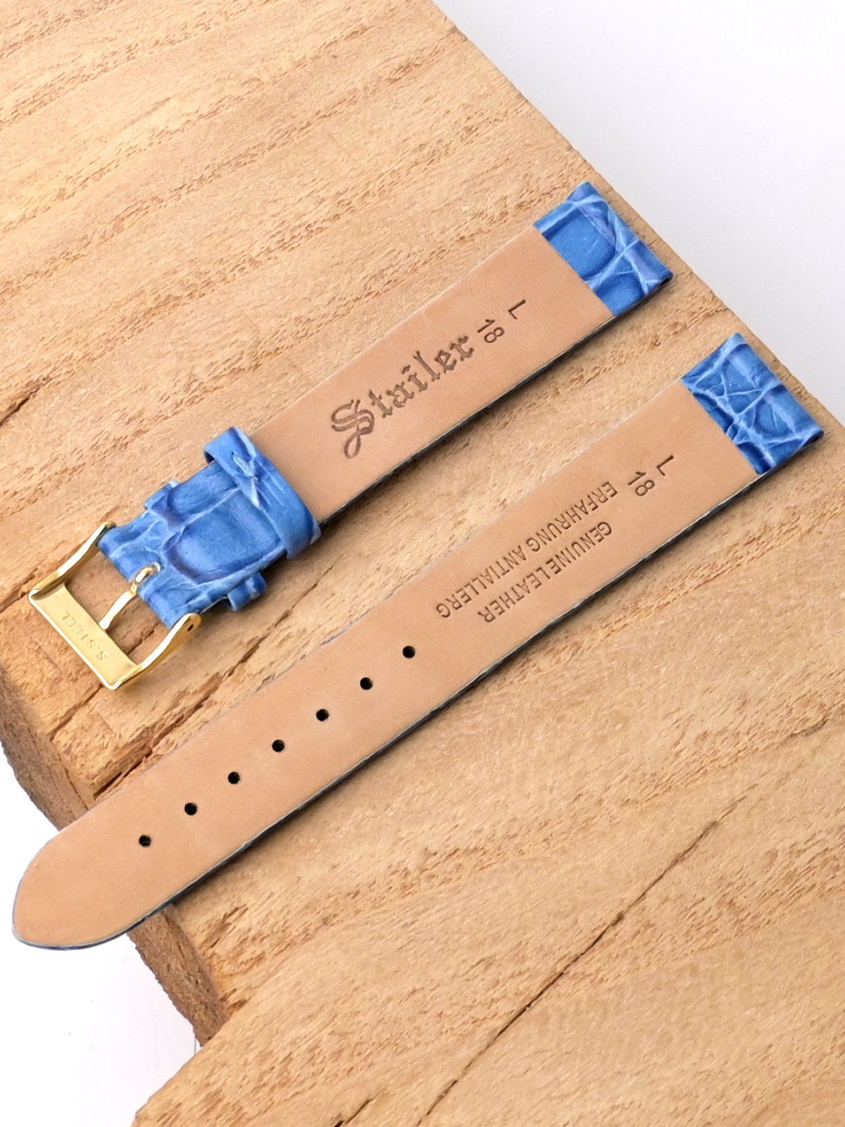 Ремешок из натуральной кожи для наручных часов. Ширина крепления: 18 мм. Ширина пряжки: 16 мм. Длина большей части: 125 мм. Длина меньшей части без застежки: 85 мм. Пряжка выполнена из нержавеющей стали с покрытием цвета желтого золота.