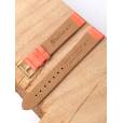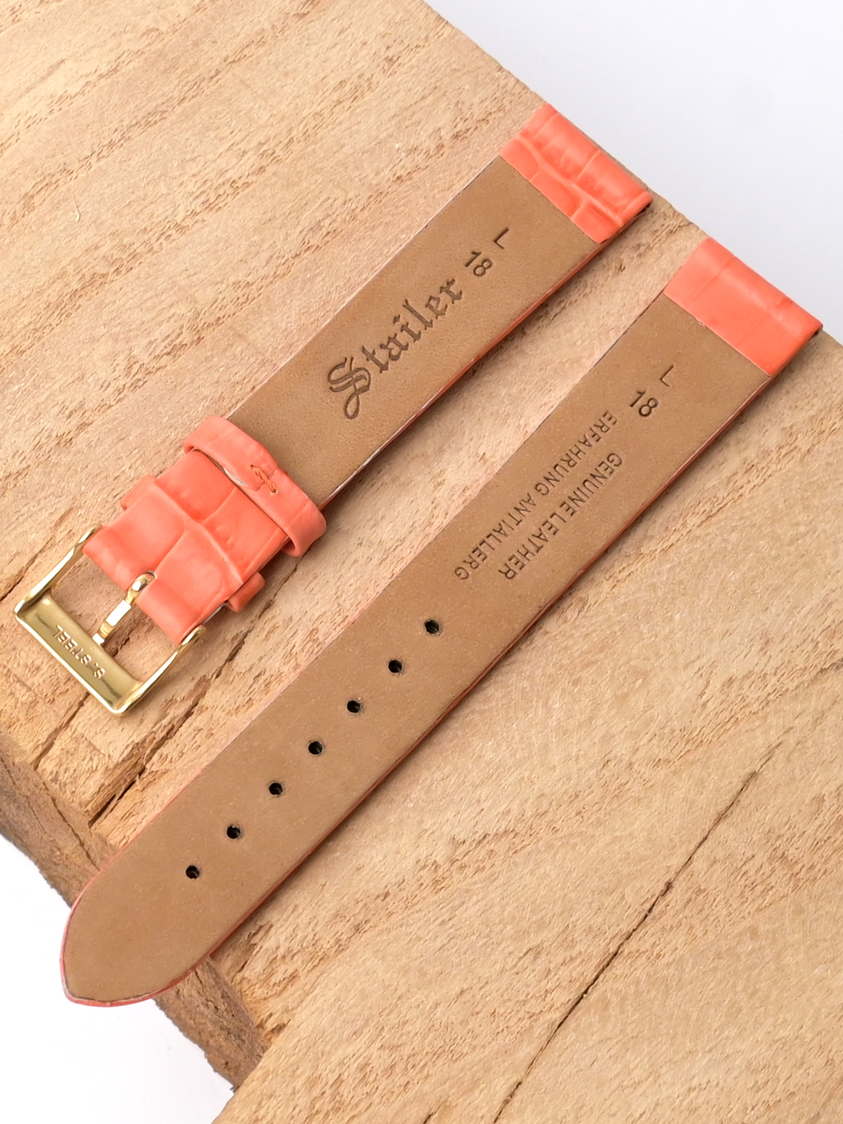 Ремешок из натуральной кожи для наручных часов. Ширина крепления: 18 мм. Ширина пряжки: 16 мм. Длина большей части: 125 мм. Длина меньшей части без застежки: 85 мм. Пряжка выполнены из нержавеющей стали с покрытием цвета желтого золота.