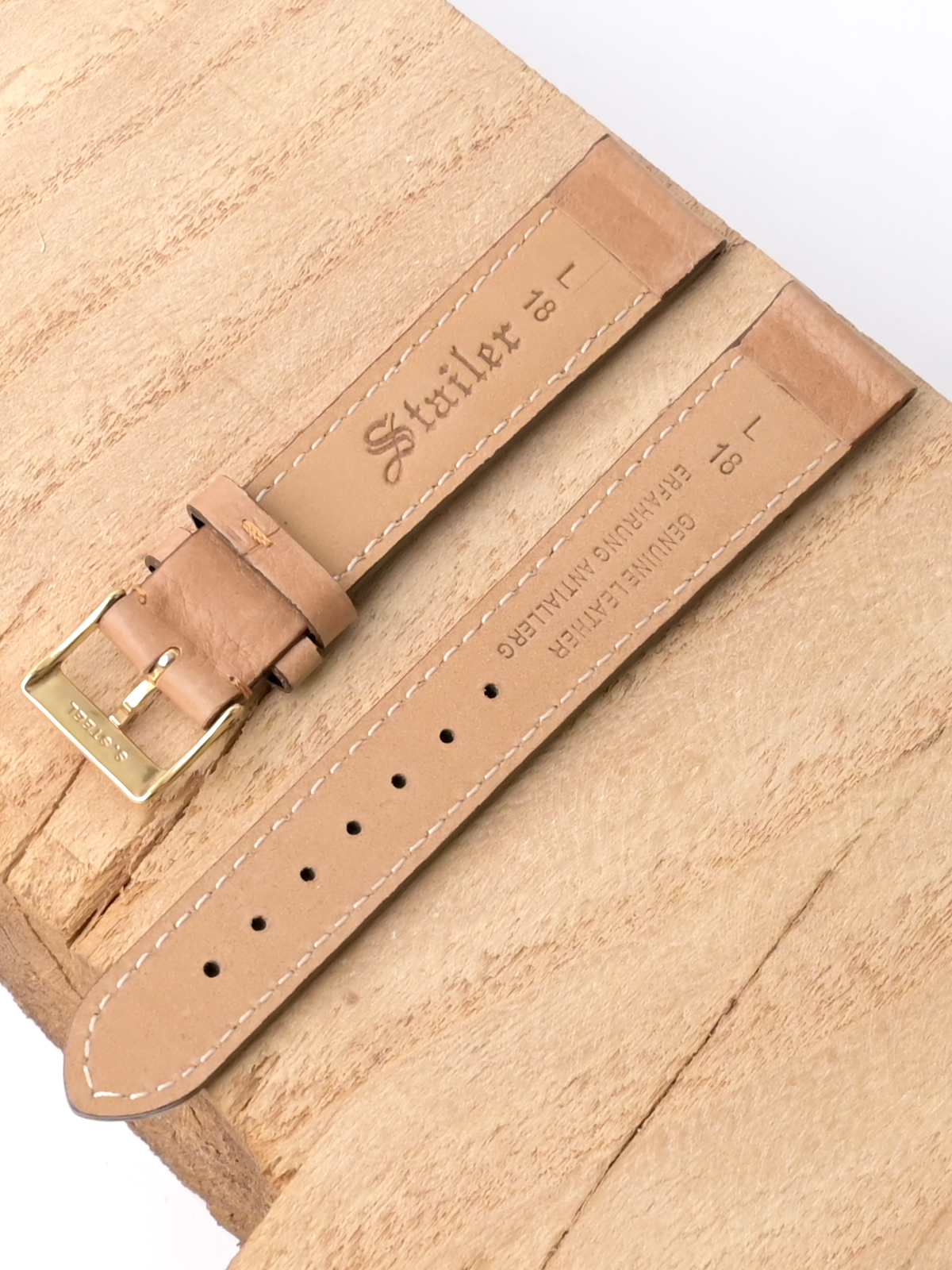 Ремешок из натуральной кожи для наручных часов. Ширина крепления: 18 мм. Ширина пряжки: 16 мм. Длина большей части: 120 мм. Длина меньшей части без застежки: 80 мм. Пряжка выполнена из нержавеющей стали с покрытием цвета желтого золота.