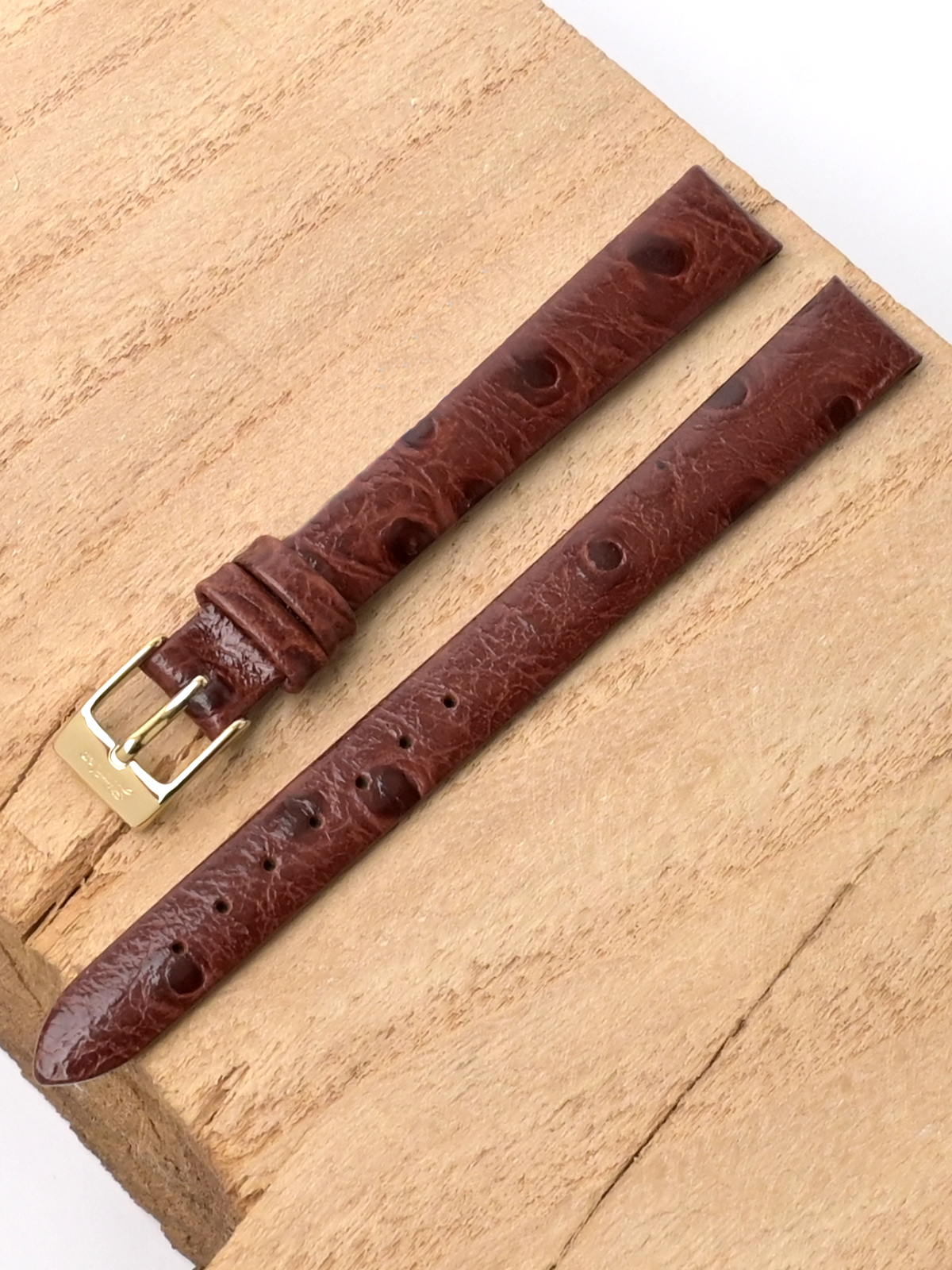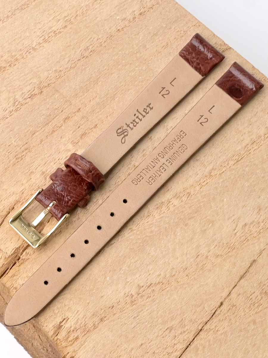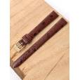 Ремешок из натуральной кожи для наручных часов. Ширина крепления: 12 мм. Ширина пряжки: 10 мм. Длина большей части: 115 мм. Длина меньшей части без застежки: 80 мм. Пряжка выполнены из нержавеющей стали с покрытием цвета желтого золота