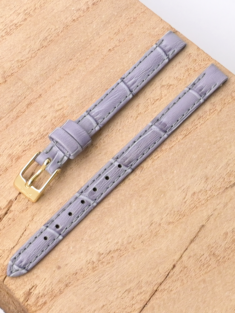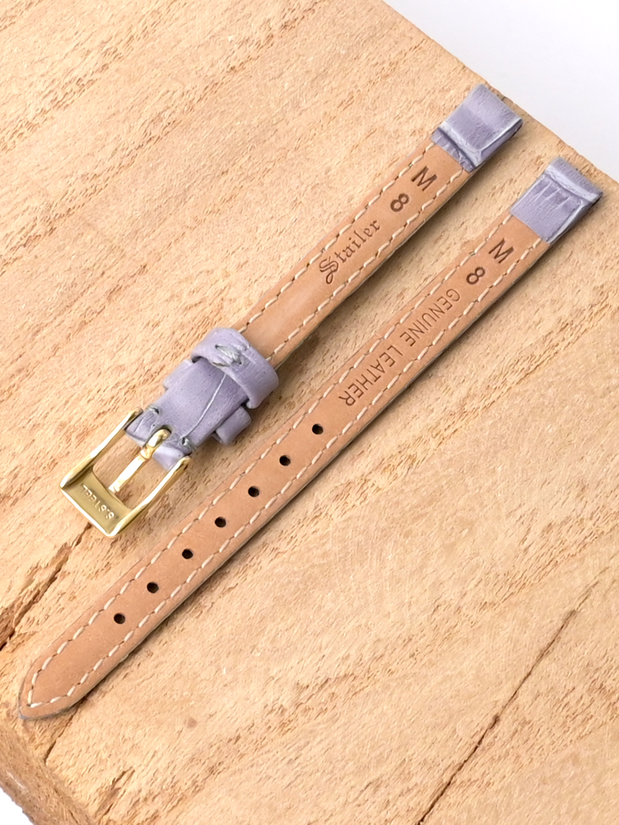 Ремешок для наручных часов из натуральной кожи. Ширина крепления: 8 мм. Ширина пряжки: 8 мм. Длина большей части: 105 мм. Длина меньшей части без застежки: 70 мм. Пряжка выполнена из нержавеющей стали c IP покрытием цвета желтого золота.