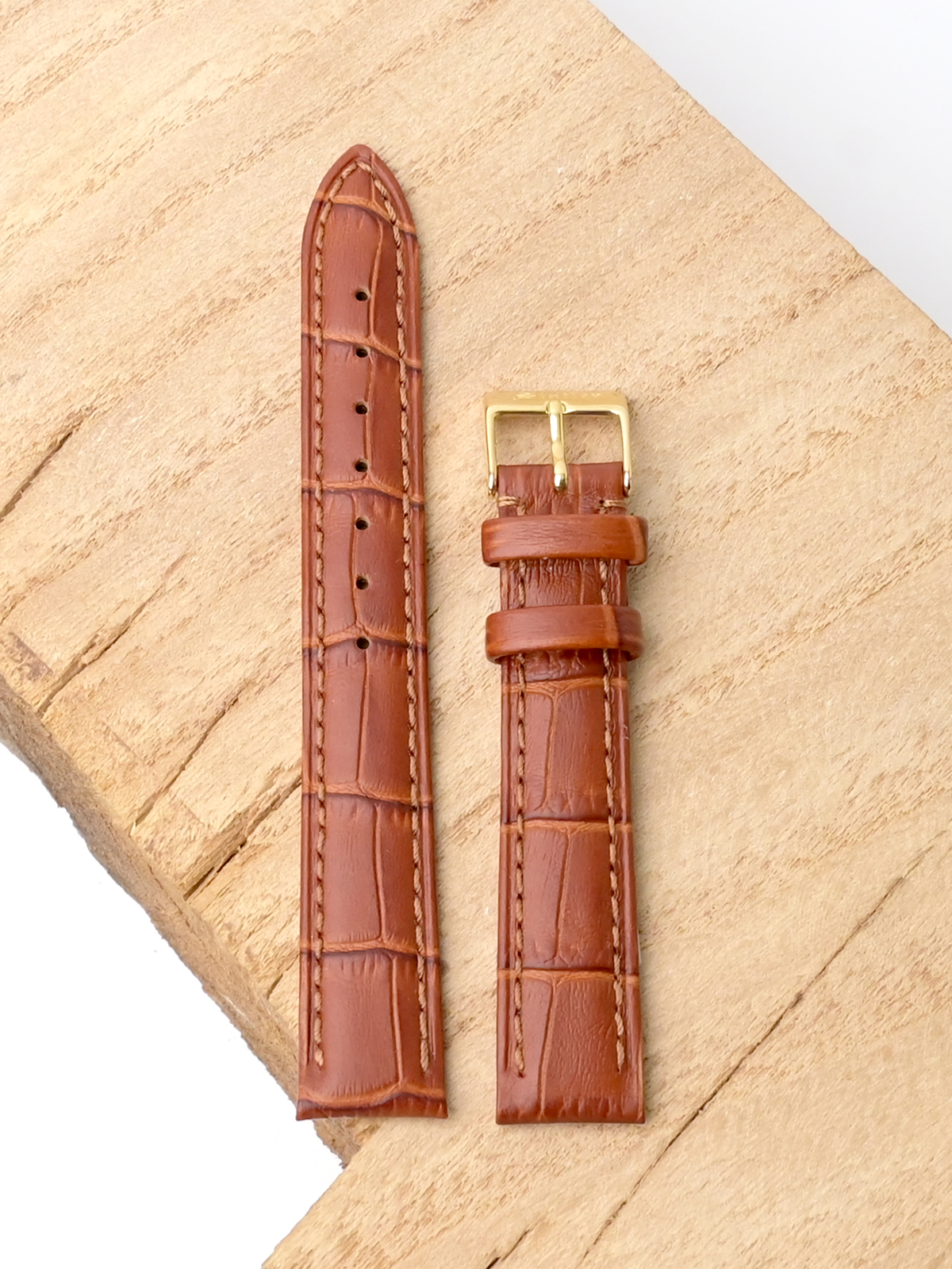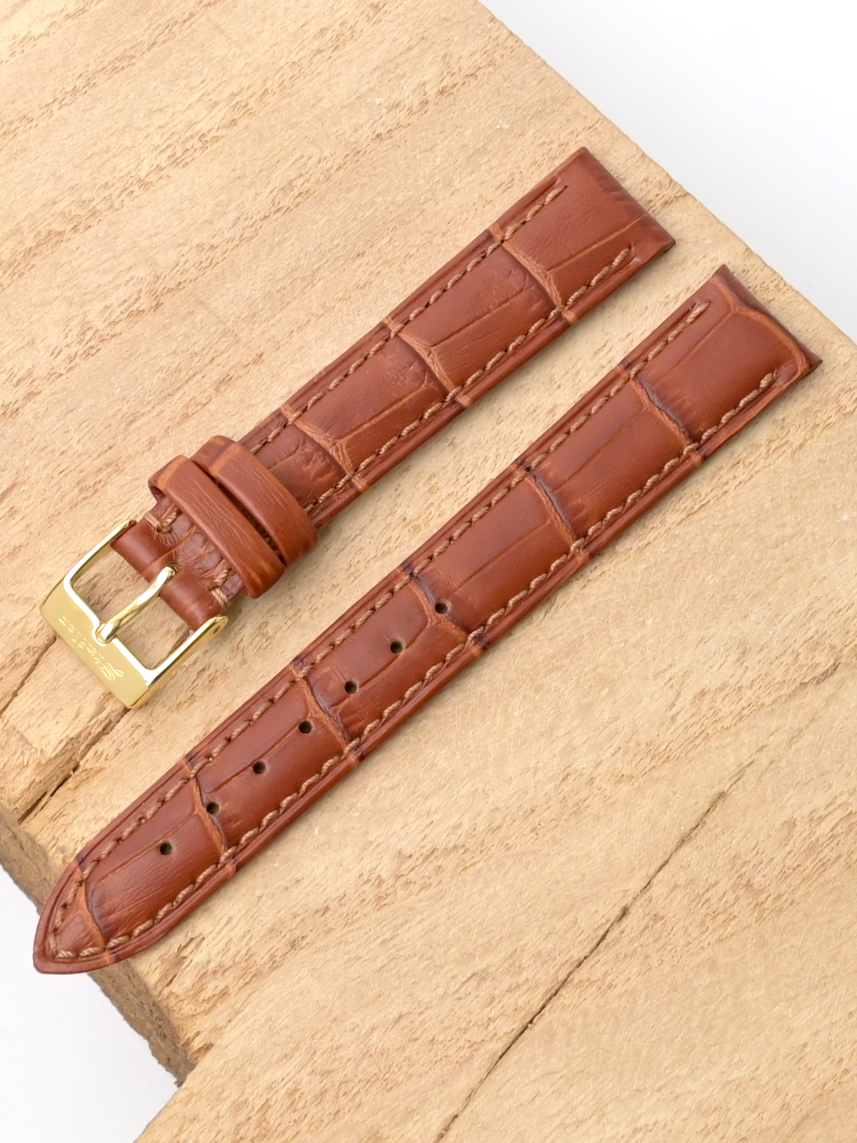Ремешок для наручных часов из натуральной кожи. Ширина крепления: 16 мм. Ширина пряжки: 14 мм. Длина большей части: 115 мм. Длина меньшей части без застежки: 75 мм. Пряжка выполнена из нержавеющей стали с IP покрытием цвета желтого золота.
