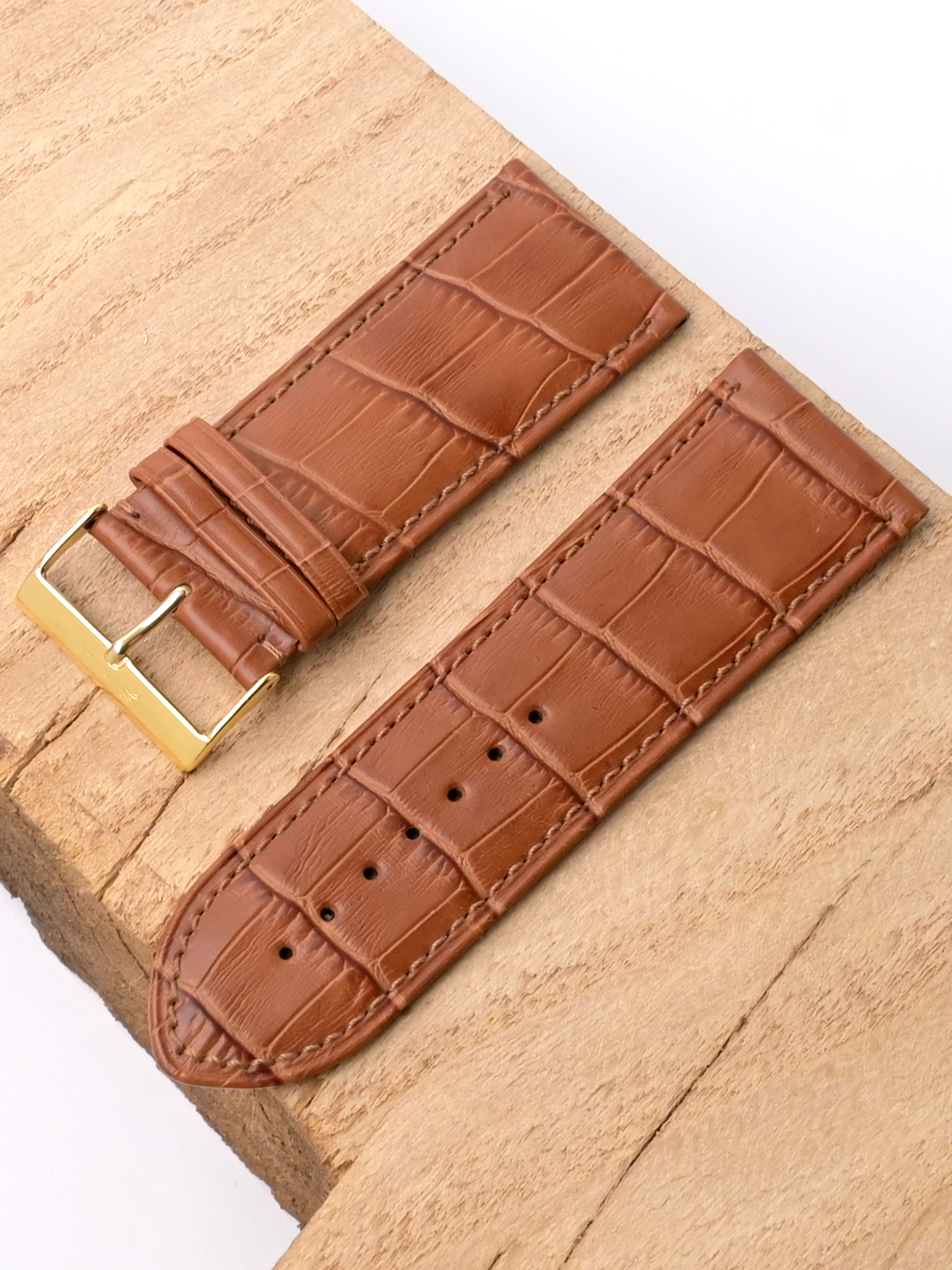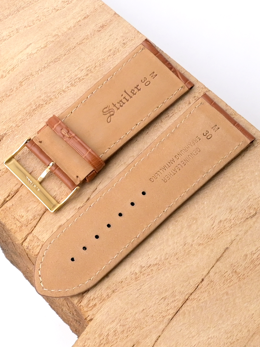 Ремешок для наручных часов из натуральной кожи. Ширина крепления: 30 мм. Ширина пряжки: 28 мм. Длина большей части: 115 мм. Длина меньшей части без застежки: 75 мм. Пряжка выполнена из нержавеющей стали с IP покрытием цвета желтого золота.