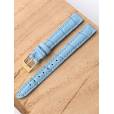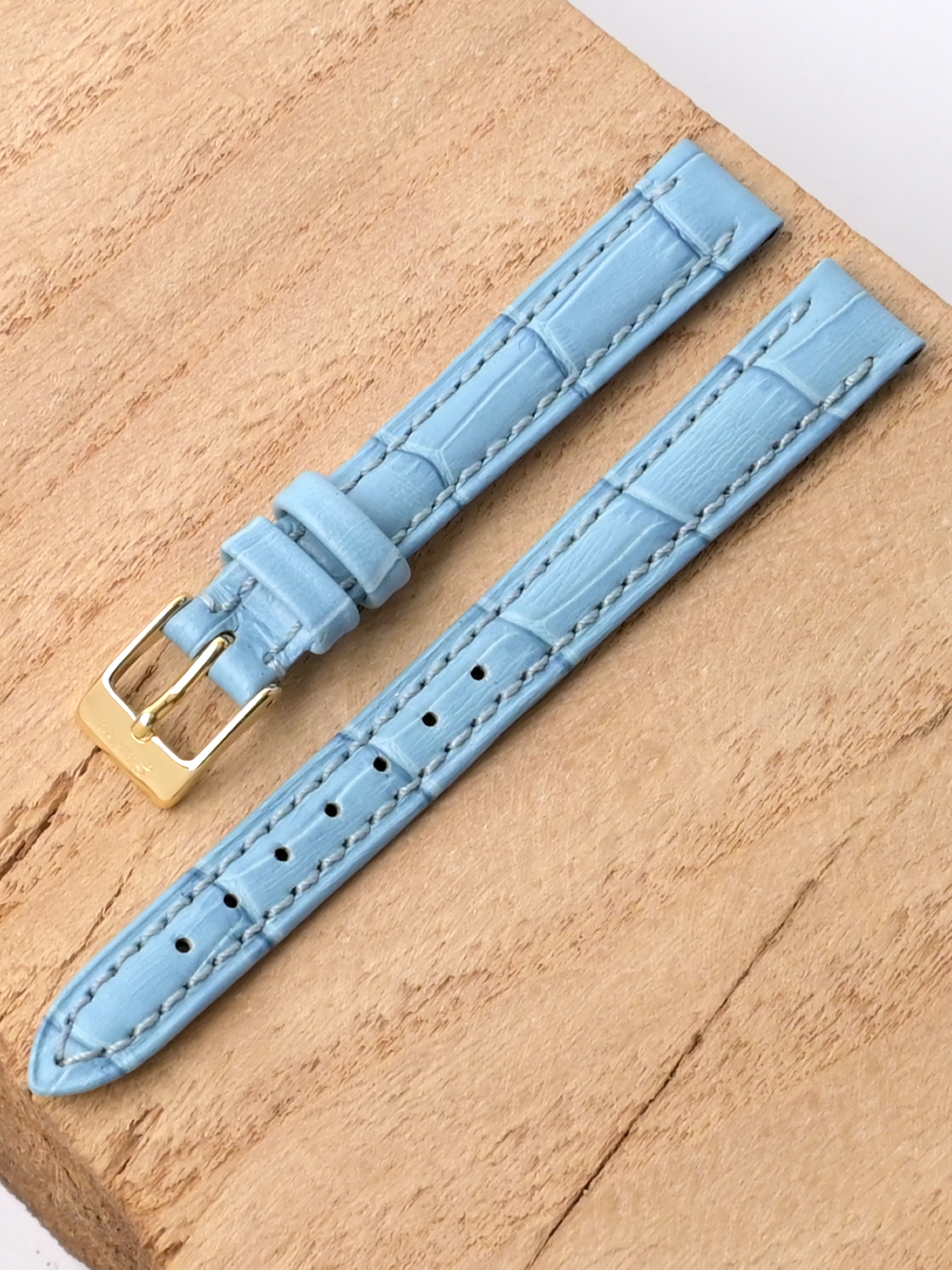 Ремешок из натуральной кожи для наручных часов. Ширина крепления: 12 мм. Ширина пряжки: 10 мм. Длина большей части: 105 мм. Длина меньшей части без застежки: 70 мм. Пряжка выполнена из нержавеющей стали с покрытием цвета желтого золота.