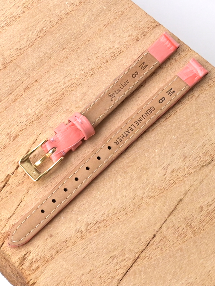 Ремешок из натуральной кожи для наручных часов. Ширина крепления: 8 мм. Ширина пряжки: 8 мм. Длина большей части: 105 мм. Длина меньшей части без застежки: 70 мм. Пряжка выполнена из нержавеющей стали с покрытием цвета желтого золота.
