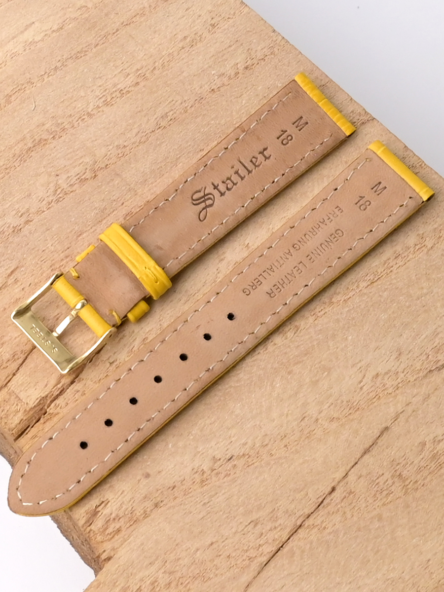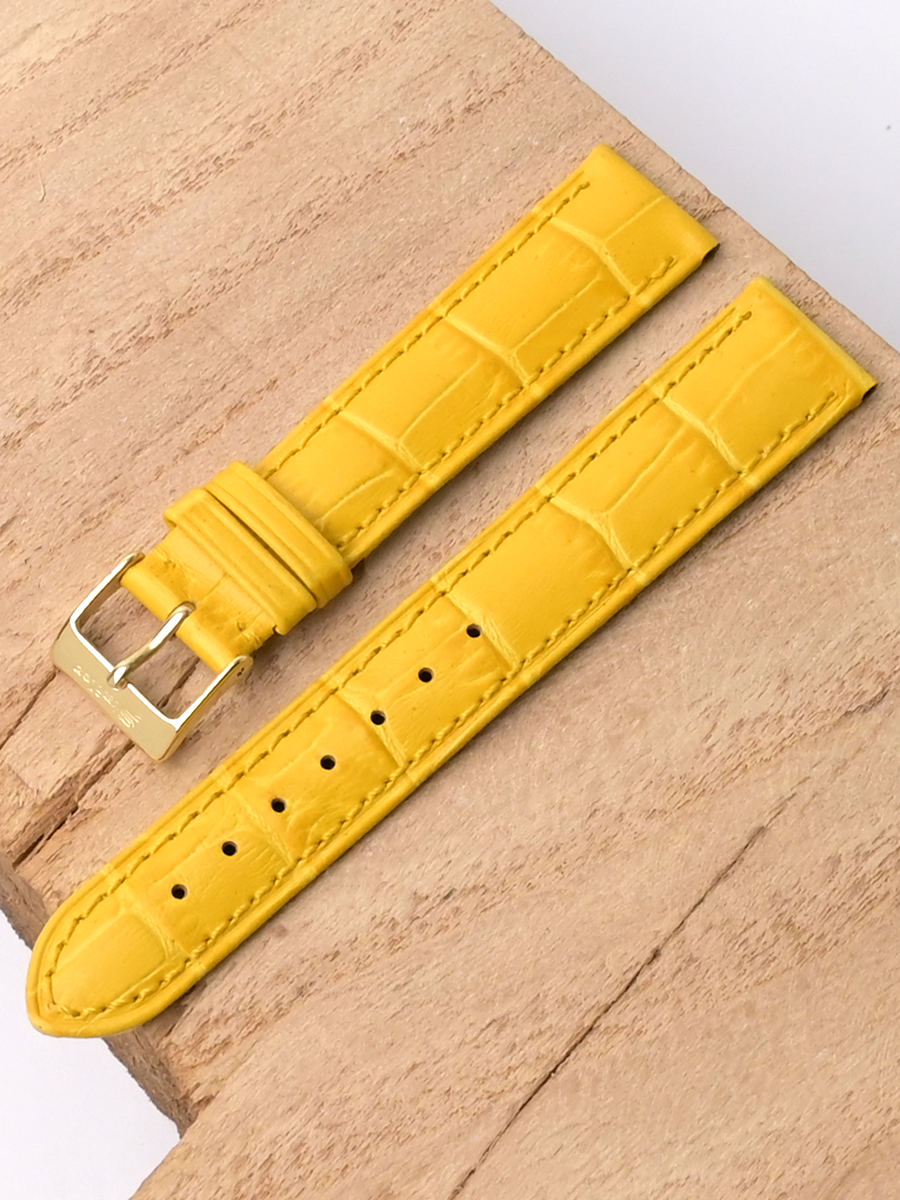 Ремешок для наручных часов из натуральной кожи. Ширина крепления: 18 мм. Ширина пряжки: 16 мм. Длина большей части: 115 мм. Длина меньшей части без застежки: 75 мм. Пряжка выполнена из нержавеющей стали с покрытием цвета желтого золота.