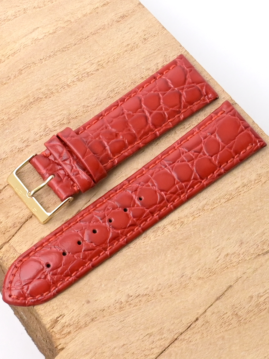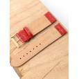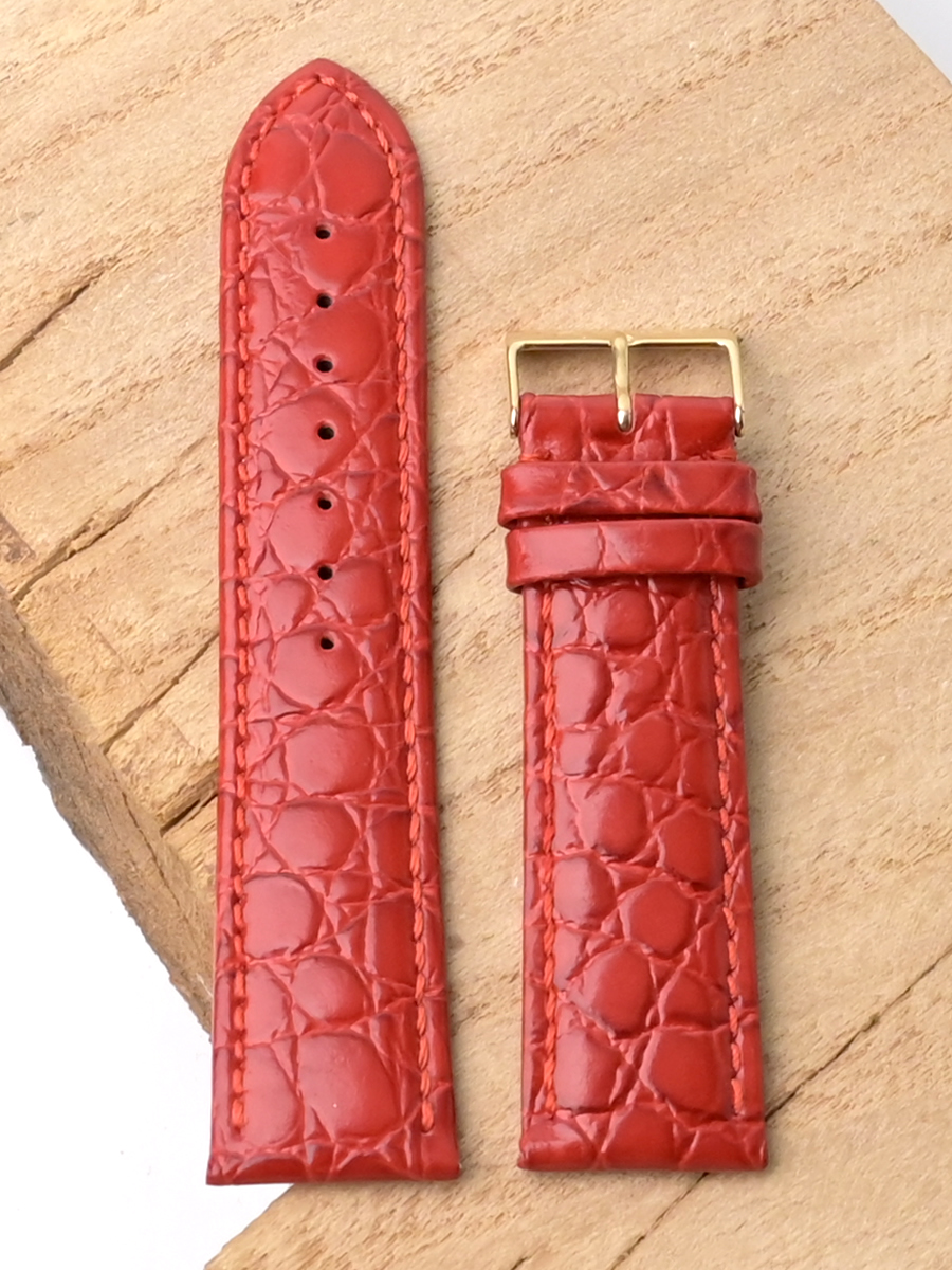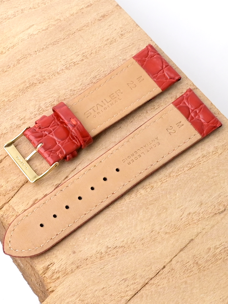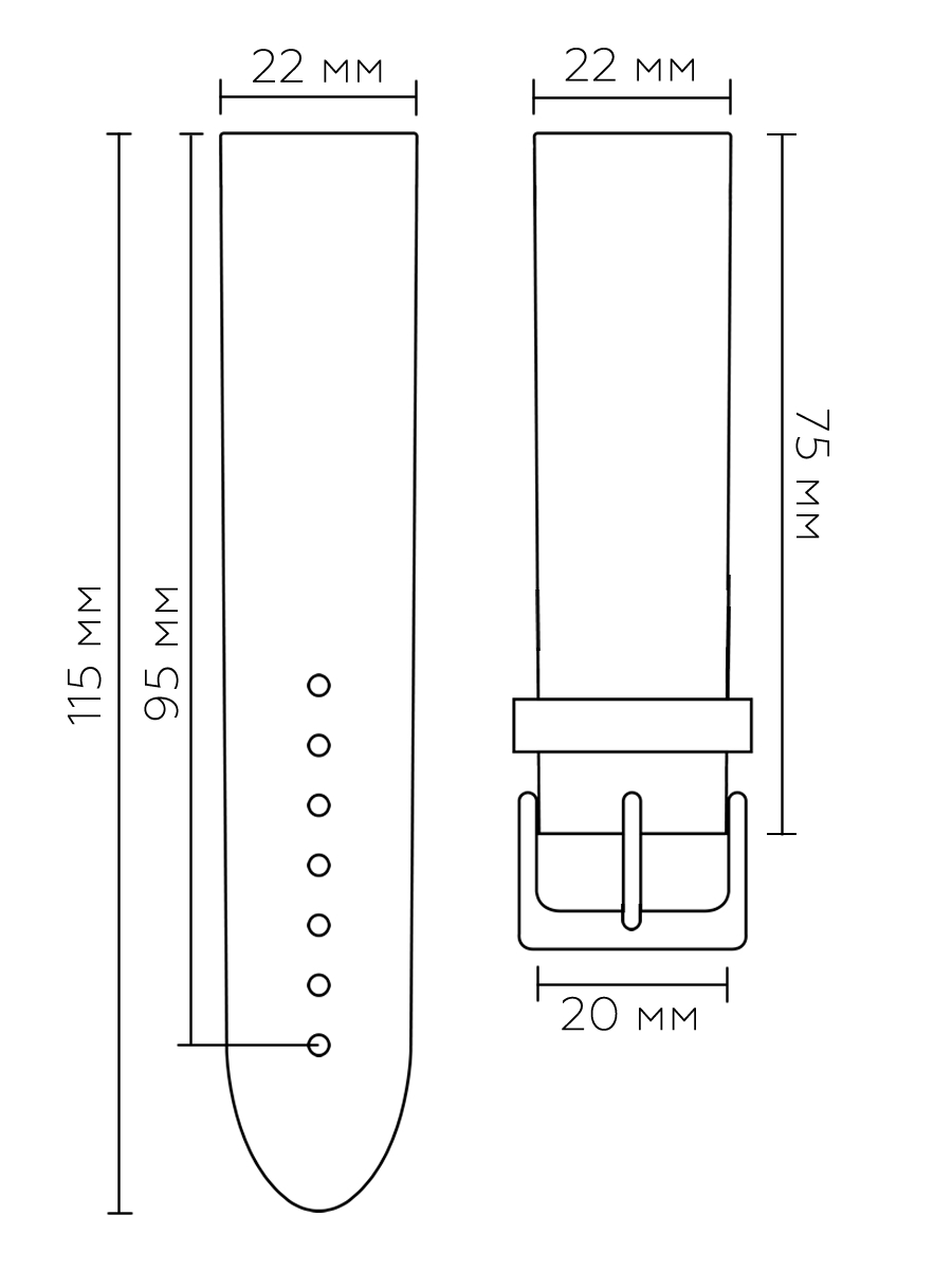 Ремешок из натуральной кожи для наручных часов. Ширина крепления: 22 мм. Ширина пряжки: 20 мм. Длина большей части: 115 мм. Длина меньшей части без застежки: 75 мм. Пряжка выполнена из нержавеющей стали с покрытием цвета желтого золота.