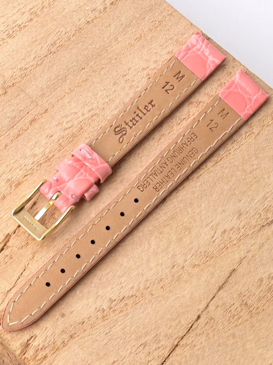 Ремешок из натуральной кожи для наручных часов. Ширина крепления: 12 мм. Ширина пряжки: 10 мм. Длина большей части: 105 мм. Длина меньшей части без застежки: 70 мм. Пряжка выполнена из нержавеющей стали с покрытием цвета желтого золота.