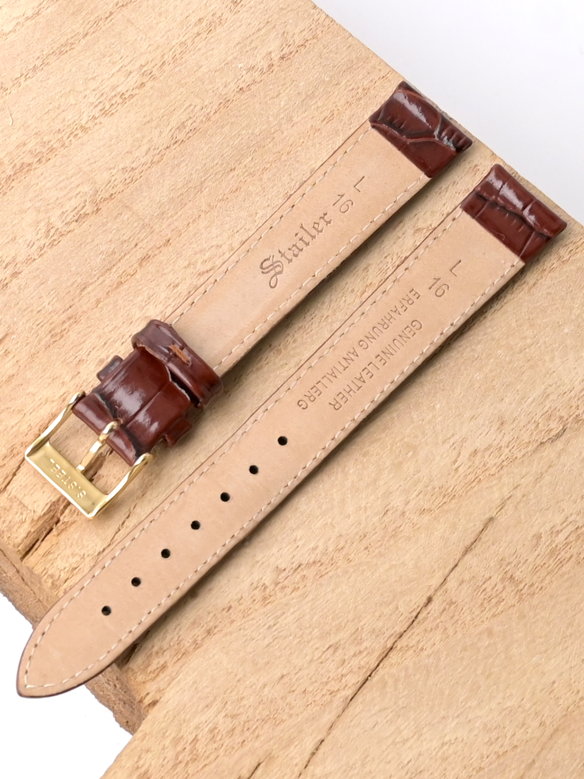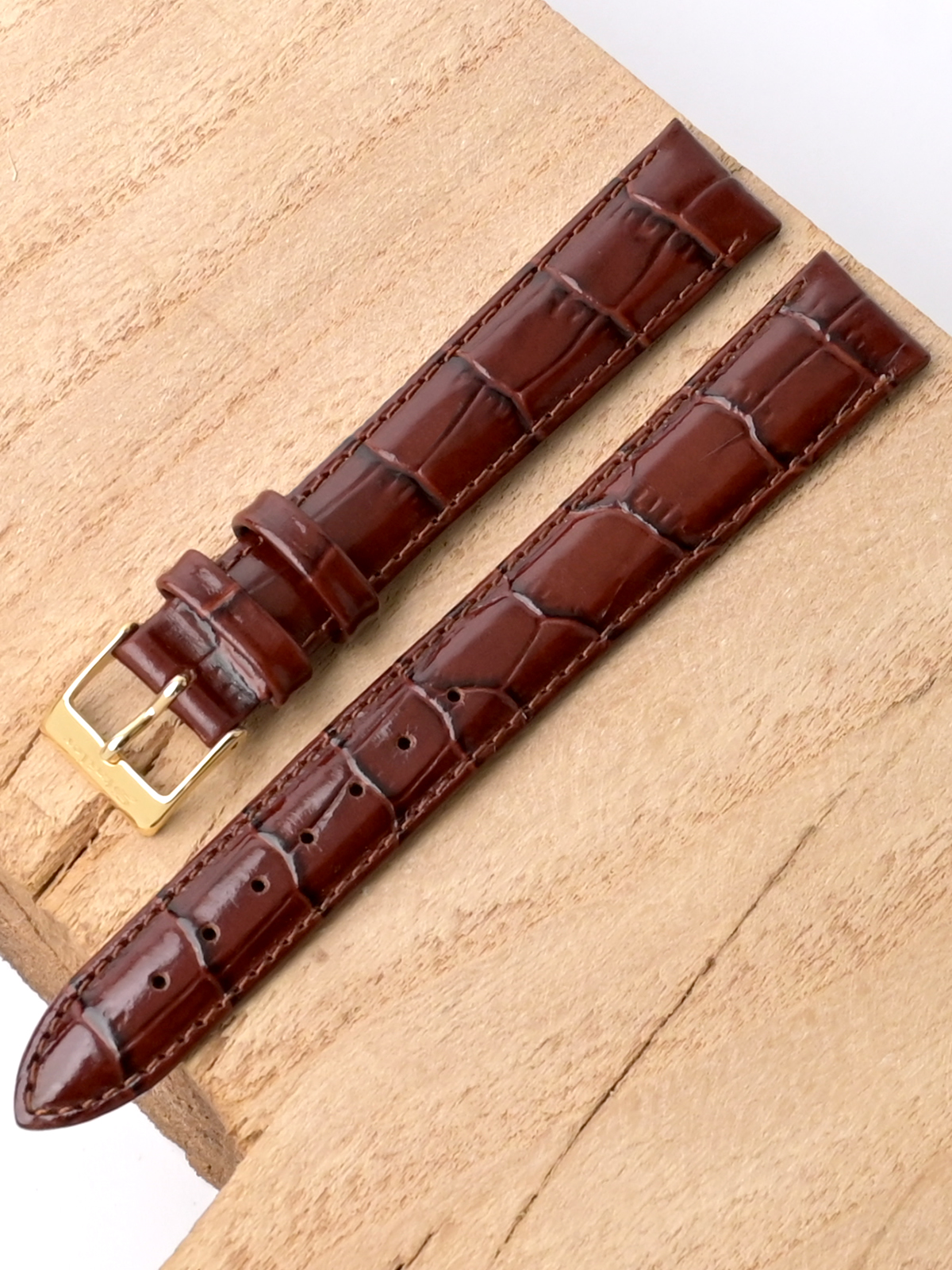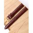 Ремешок из натуральной кожи для наручных часов. Ширина крепления: 16 мм. Ширина пряжки: 14 мм. Длина большей части: 125 мм. Длина меньшей части без застежки: 85 мм. Пряжка выполнены из нержавеющей стали с покрытием цвета желтого золота.