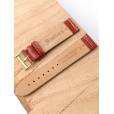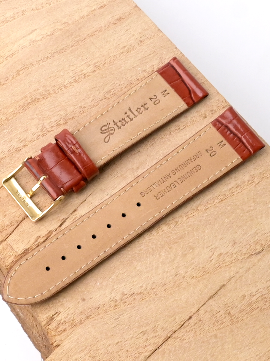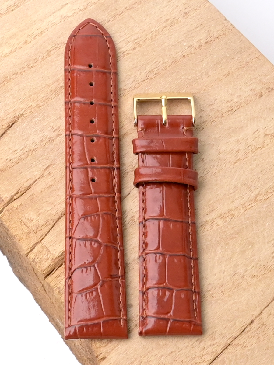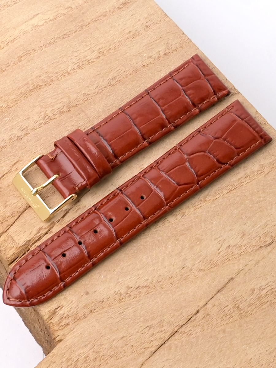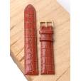 Ремешок из натуральной кожи для наручных часов. Ширина крепления: 20 мм. Ширина пряжки: 18 мм. Длина большей части: 115 мм. Длина меньшей части без застежки: 75 мм. Пряжка выполнена из нержавеющей стали с покрытием цвета желтого золота.