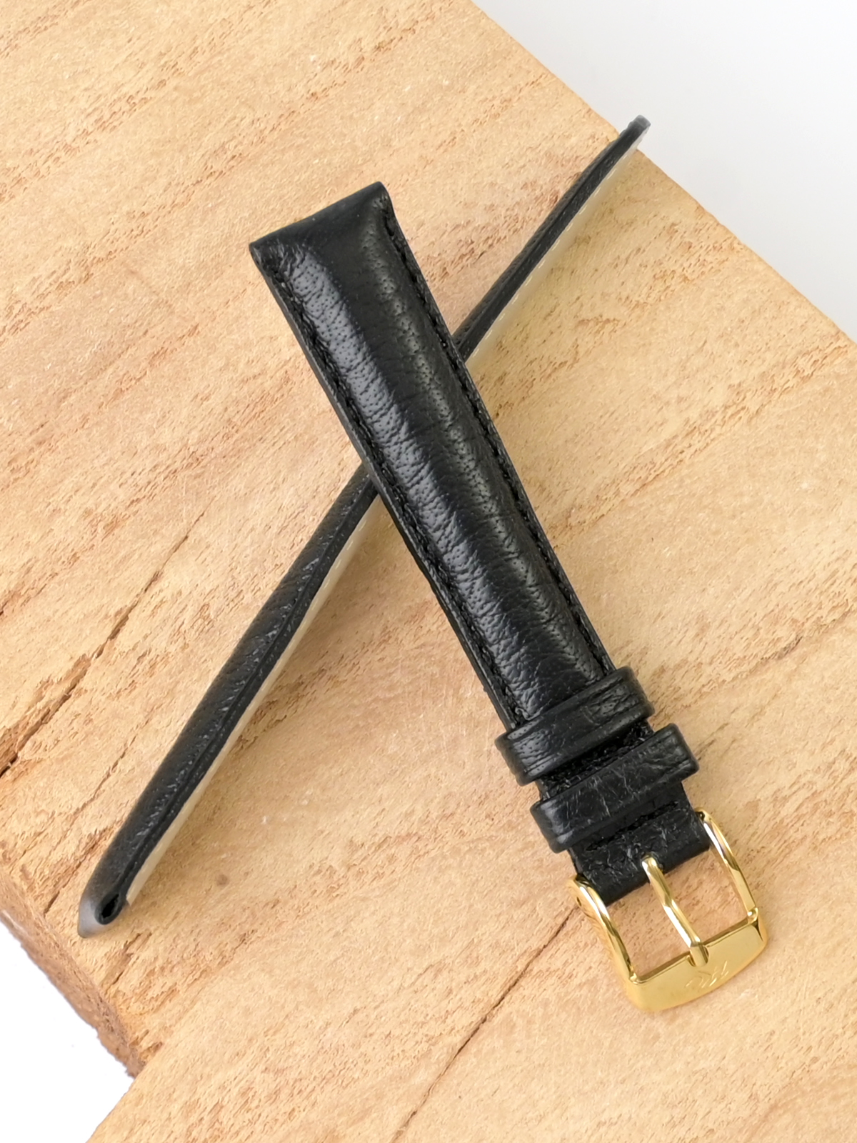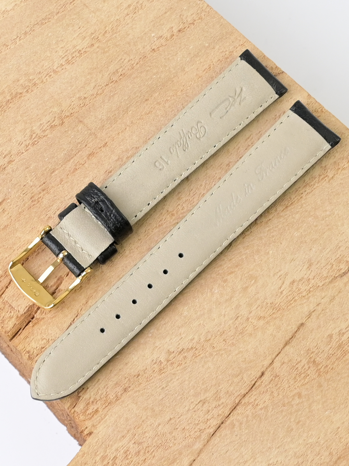 Ремешок из натуральной кожи для наручных часов. Ширина крепления: 16 мм. Ширина пряжки: 14 мм. Длина большей части: 110 мм. Длина меньшей части без застежки: 80 мм. Пряжка выполнена из нержавеющей стали с IP покрытием цвета желтого золота.