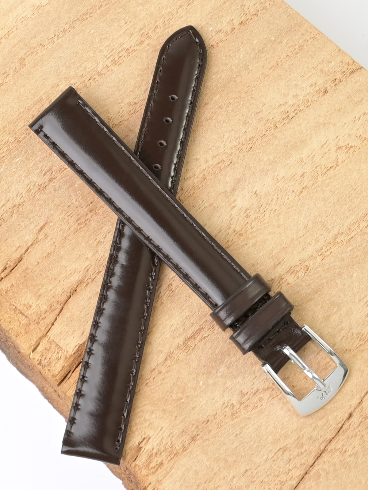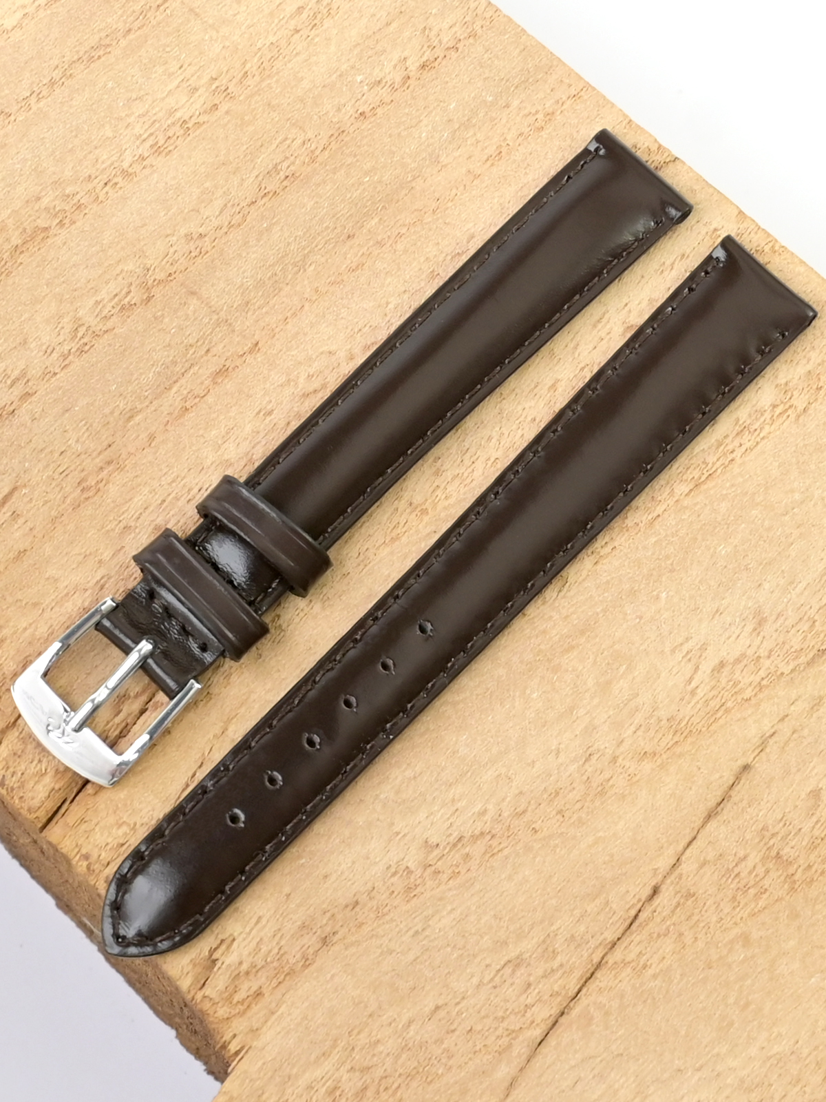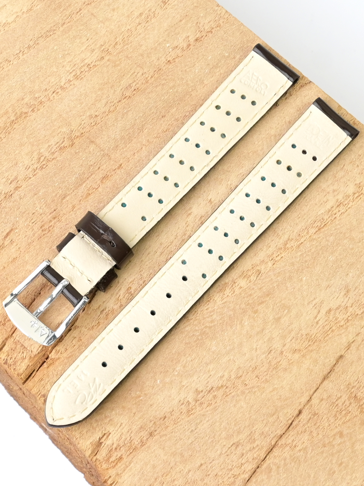 Ремешок из натуральной кожи для наручных часов. Ширина крепления: 14 мм. Ширина пряжки: 12 мм. Длина большей части: 110 мм. Длина меньшей части без застежки: 85 мм. Для более комфортного ношения внутренняя часть ремешка имеет перфорацию. Пряжка выполнена из алюминия.