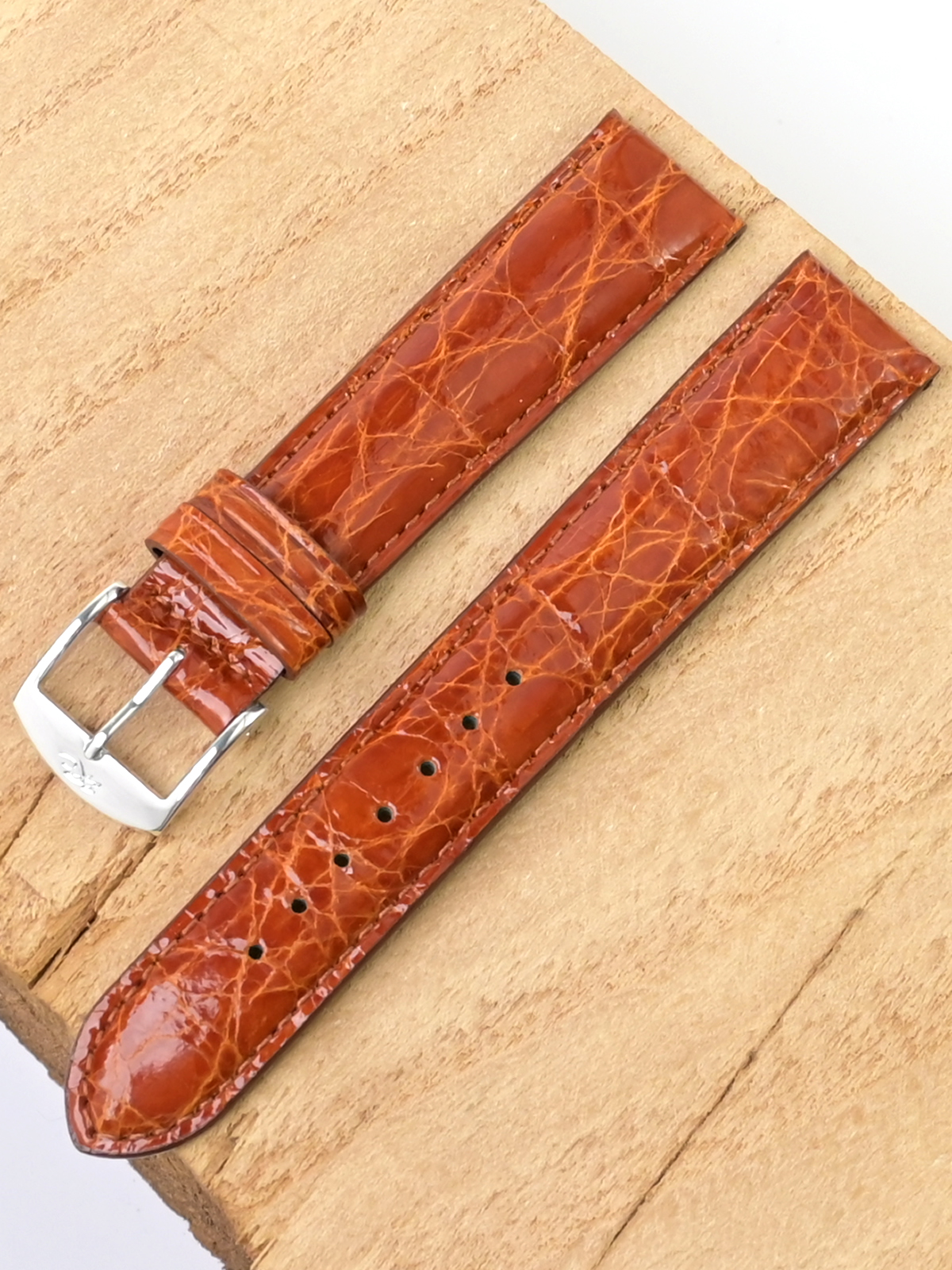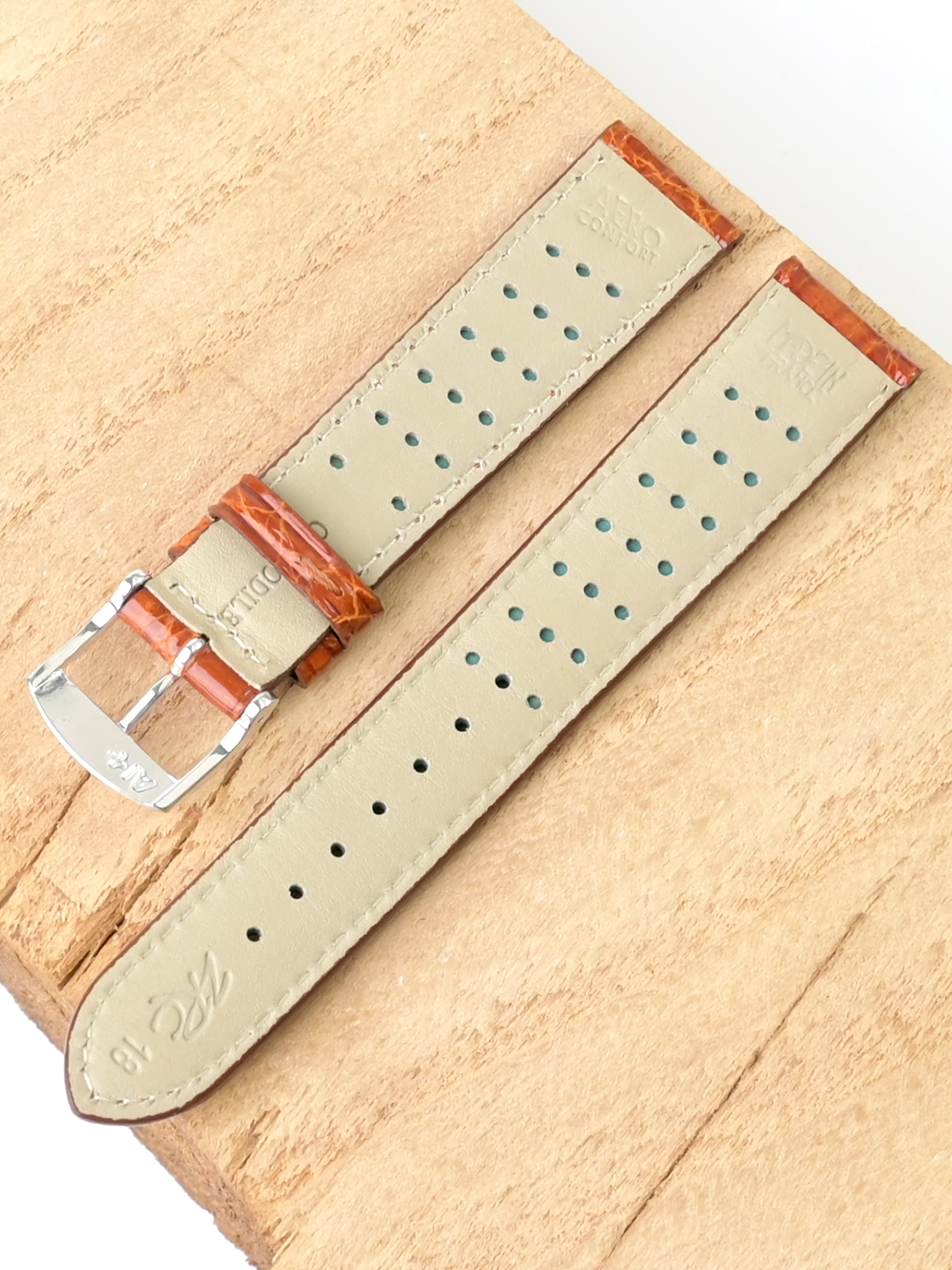 Ремешок из натуральной кожи для наручных часов. Ширина крепления: 18 мм. Ширина пряжки: 16 мм. Длина большей части: 115 мм. Длина меньшей части без застежки: 75 мм. Для более комфортного ношения внутренняя часть ремешка имеет перфорацию. Пряжка выполнена из алюминия.