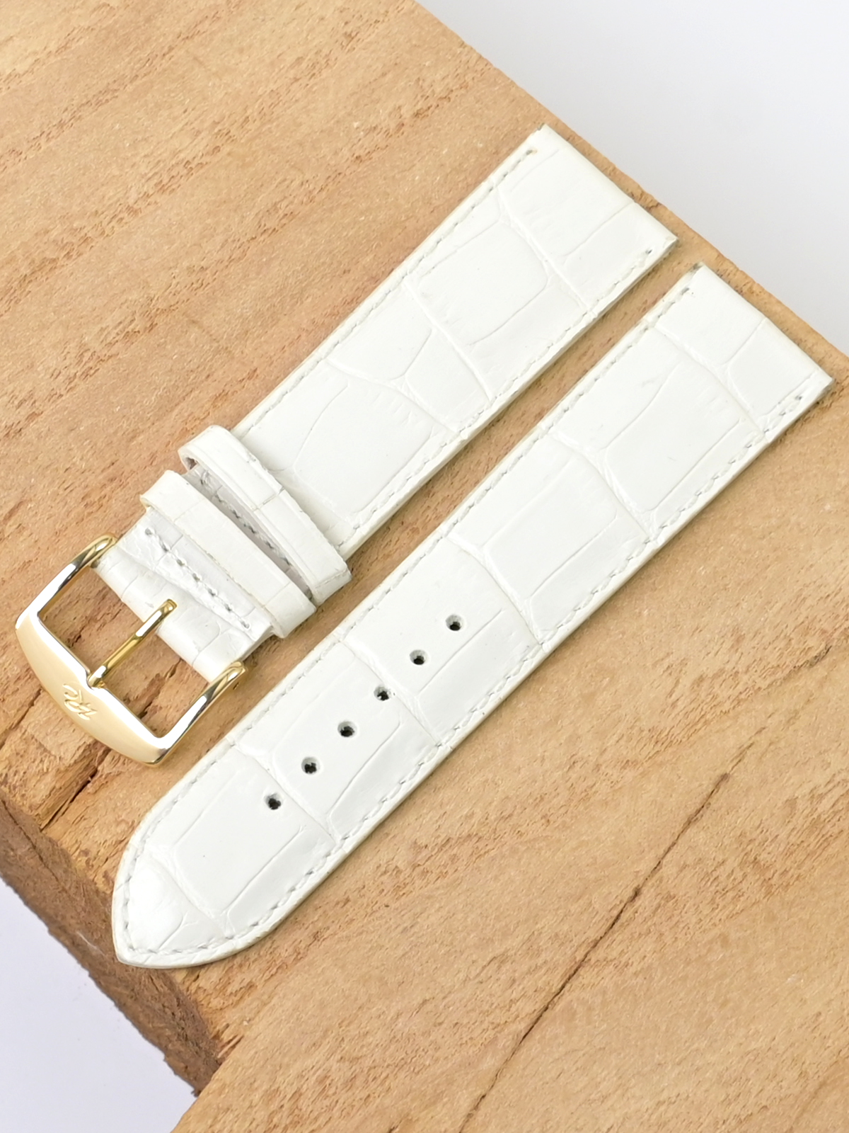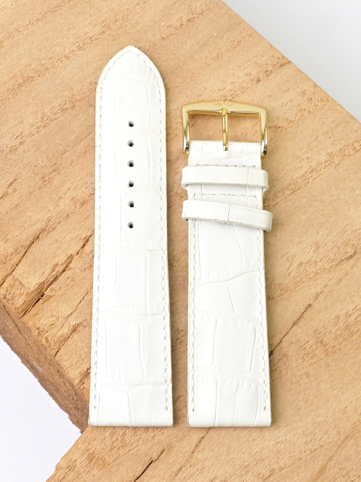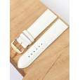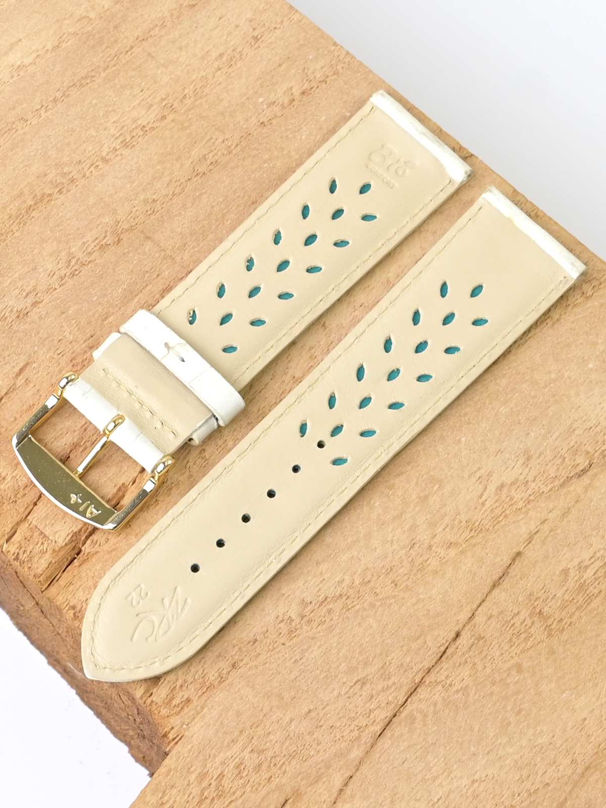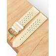 Ремешок из натуральной кожи для наручных часов. Ширина крепления: 22 мм. Ширина пряжки: 20 мм. Длина большей части: 110 мм. Длина меньшей части без застежки: 80 мм. Для более комфортного ношения внутренняя часть ремешка имеет перфорацию. Пряжка выполнены из алюминия с покрытием цвета желтого золота.