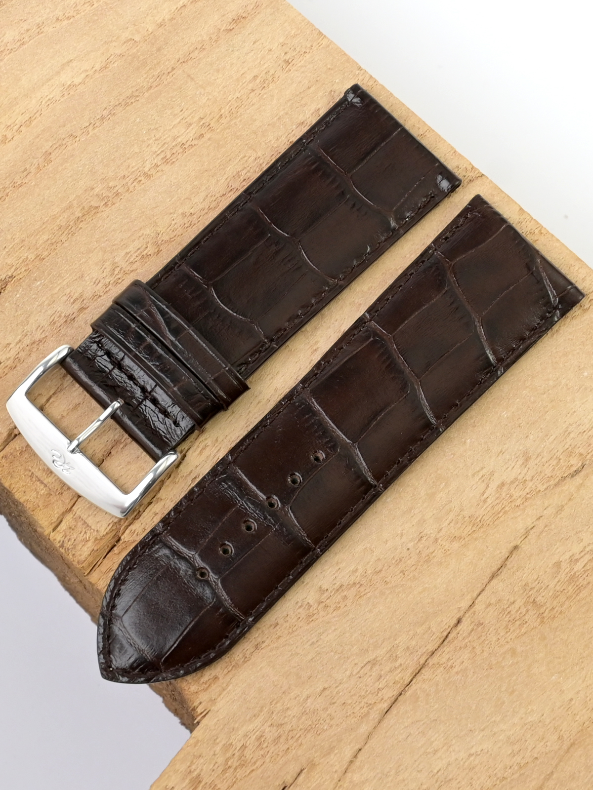 Ремешок из натуральной кожи для наручных часов. Ширина крепления: 28 мм. Ширина пряжки: 26 мм. Длина большей части: 115 мм. Длина меньшей части без застежки: 80 мм. Для более комфортного ношения внутренняя часть ремешка имеет перфорацию. Пряжка выполнены из алюминия.