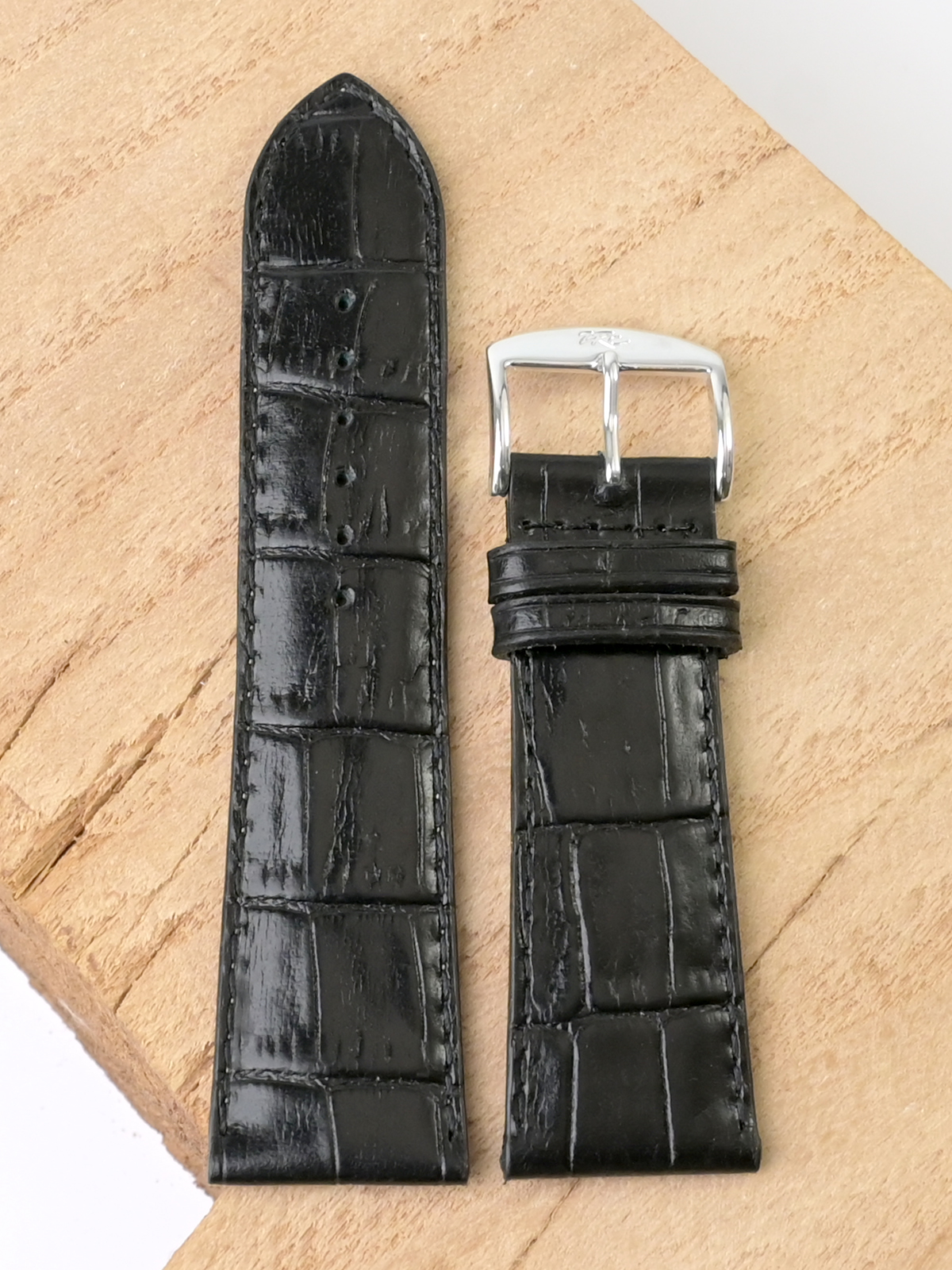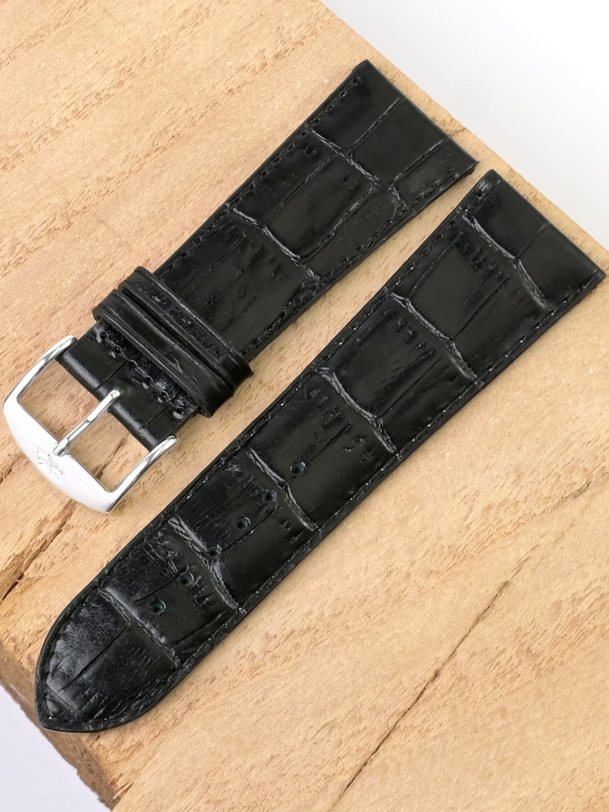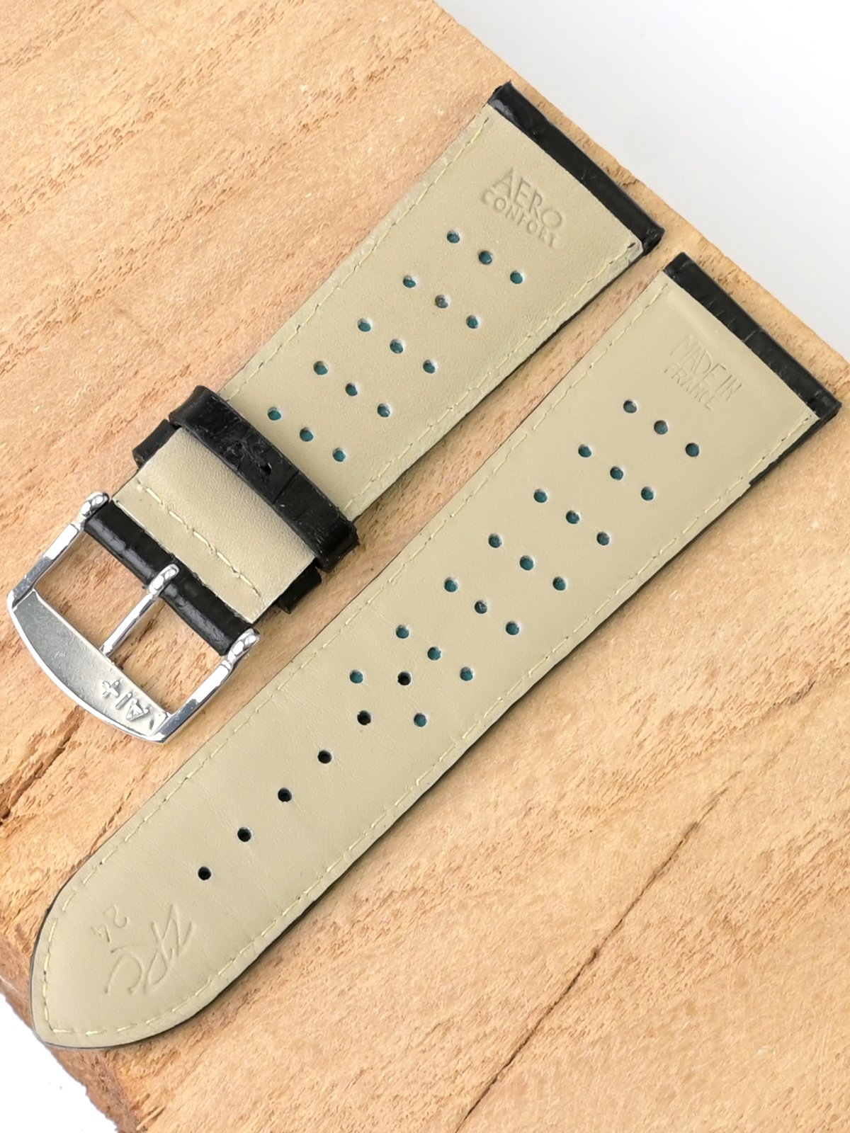 Ремешок из натуральной кожи для наручных часов. Ширина крепления: 24 мм. Ширина пряжки: 20 мм. Длина большей части: 110 мм. Длина меньшей части без застежки: 70 мм. Для более комфортного ношения внутренняя часть ремешка имеет перфорацию. Пряжка выполнены из алюминия.