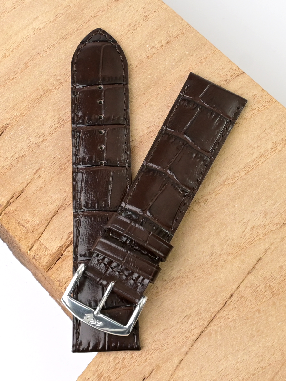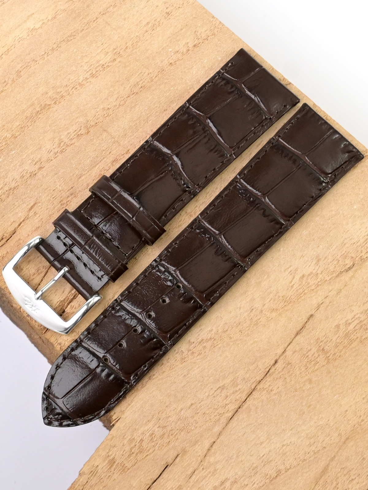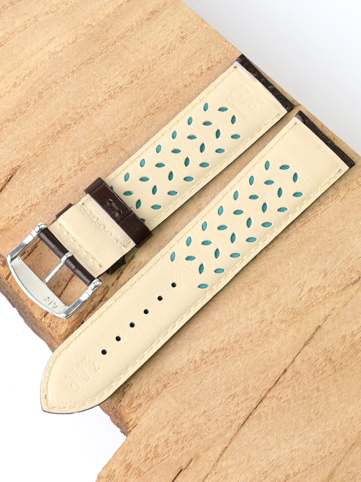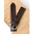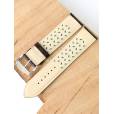Ремешок из натуральной кожи для наручных часов. Ширина крепления: 24 мм. Ширина пряжки: 22 мм. Длина большей части: 125 мм. Длина меньшей части без застежки: 90 мм. Для более комфортного ношения внутренняя часть ремешка имеет перфорацию. Пряжка выполнены из алюминия.