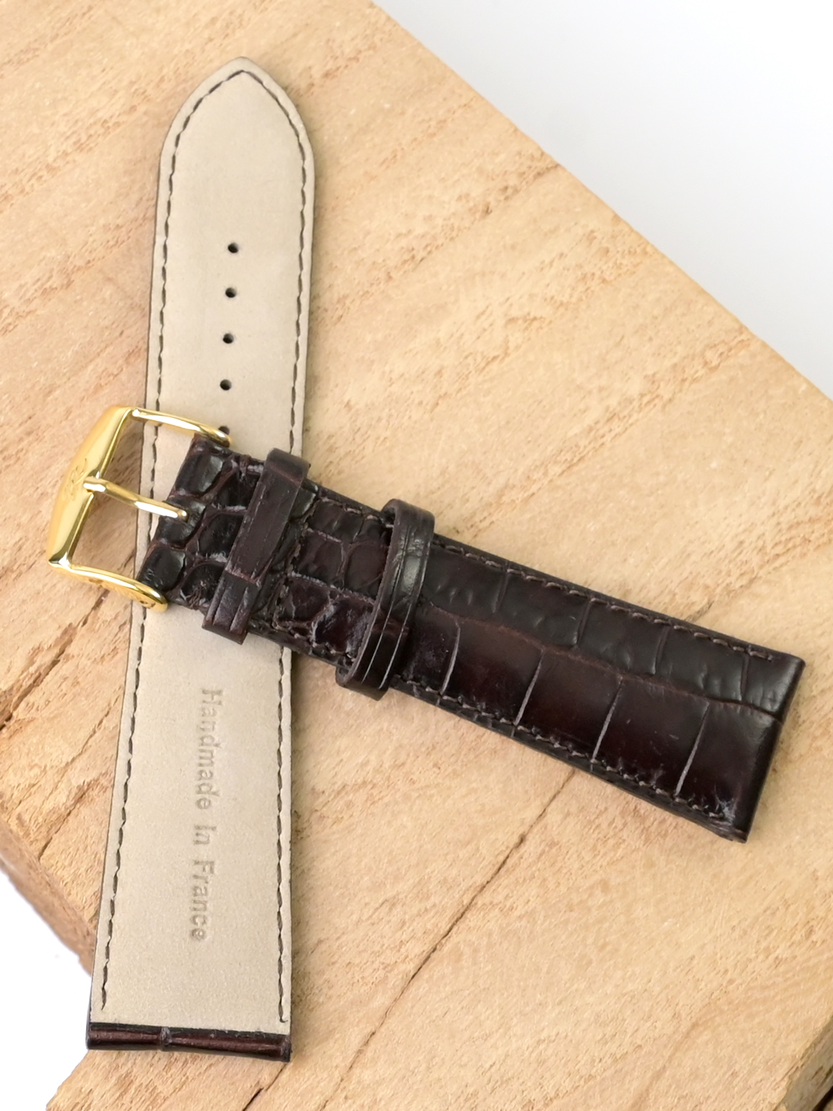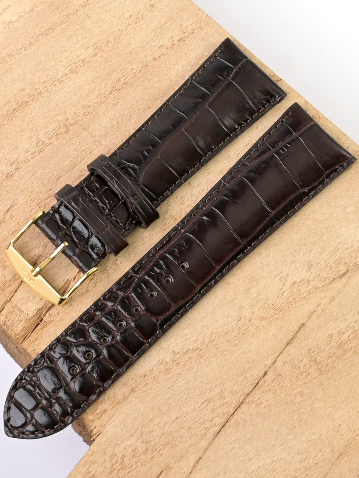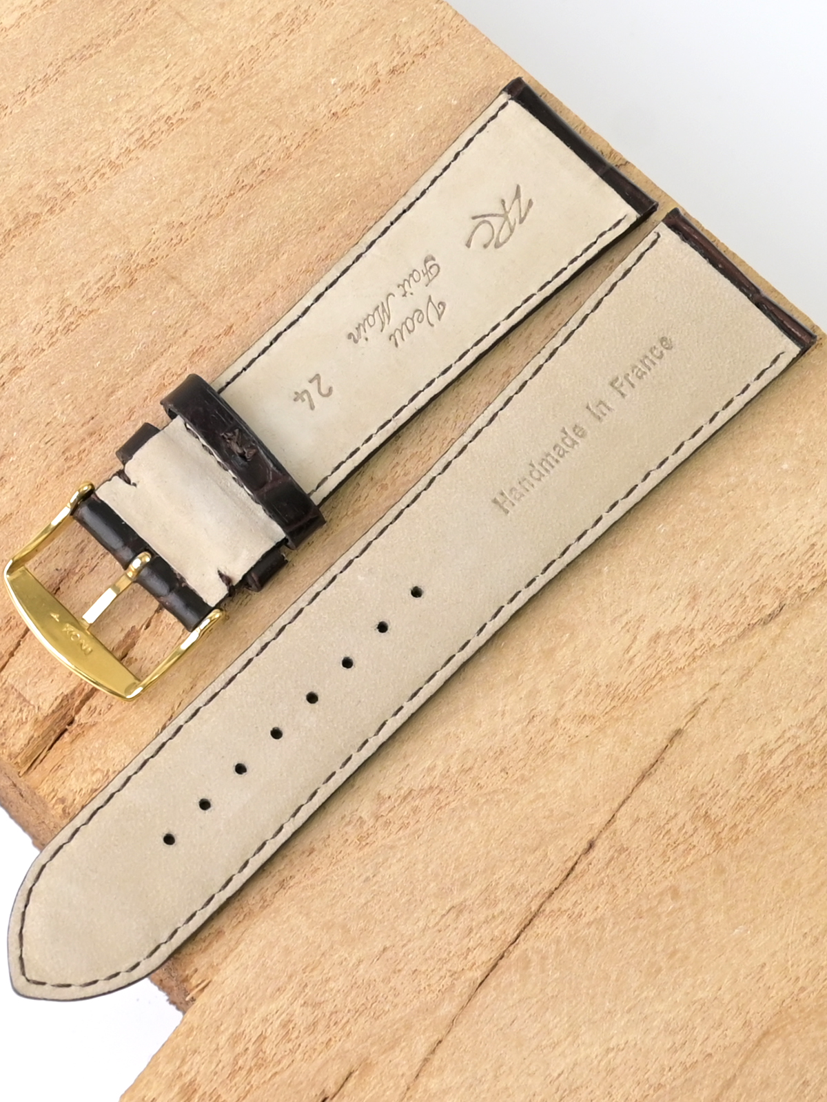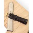 Ремешок из натуральной кожи для наручных часов. Ширина крепления: 24 мм. Ширина пряжки: 20 мм. Длина большей части: 125 мм. Длина меньшей части без застежки: 80 мм. Пряжка выполнены из нержавеющей стали с IP покрытием золотого цвета.