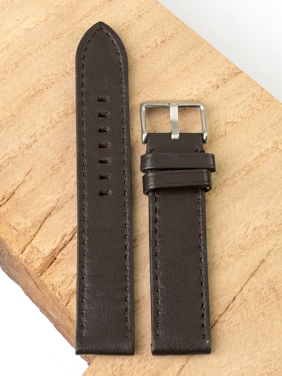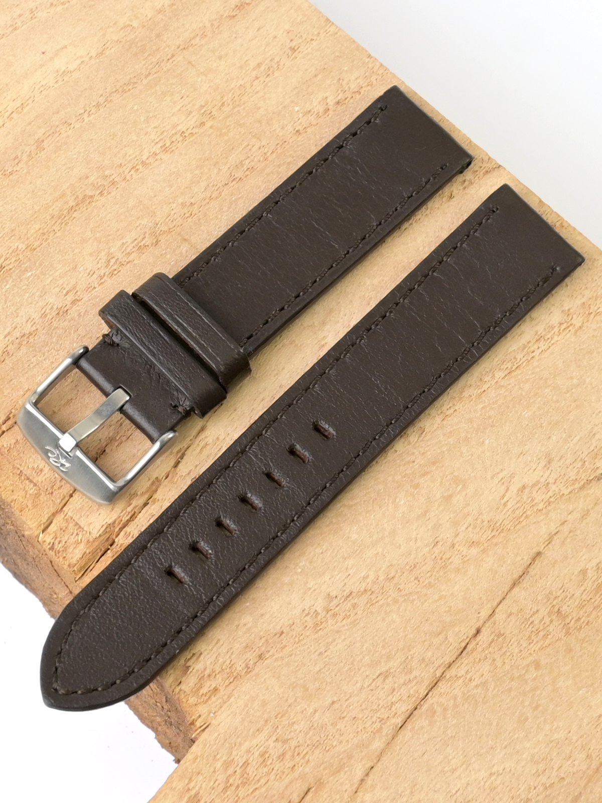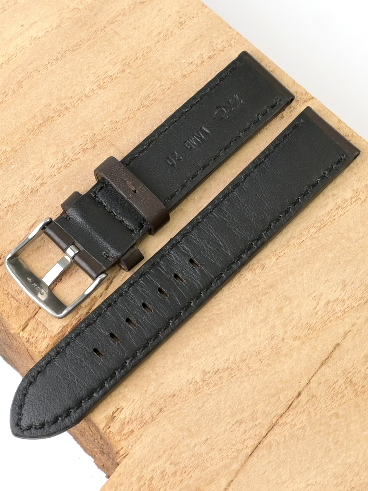Ремешок из натуральной кожи для наручных часов. Ширина крепления: 20 мм. Ширина пряжки: 20 мм. Длина большей части: 125 мм. Длина меньшей части без застежки: 80 мм. Пряжка из полированной стали.