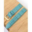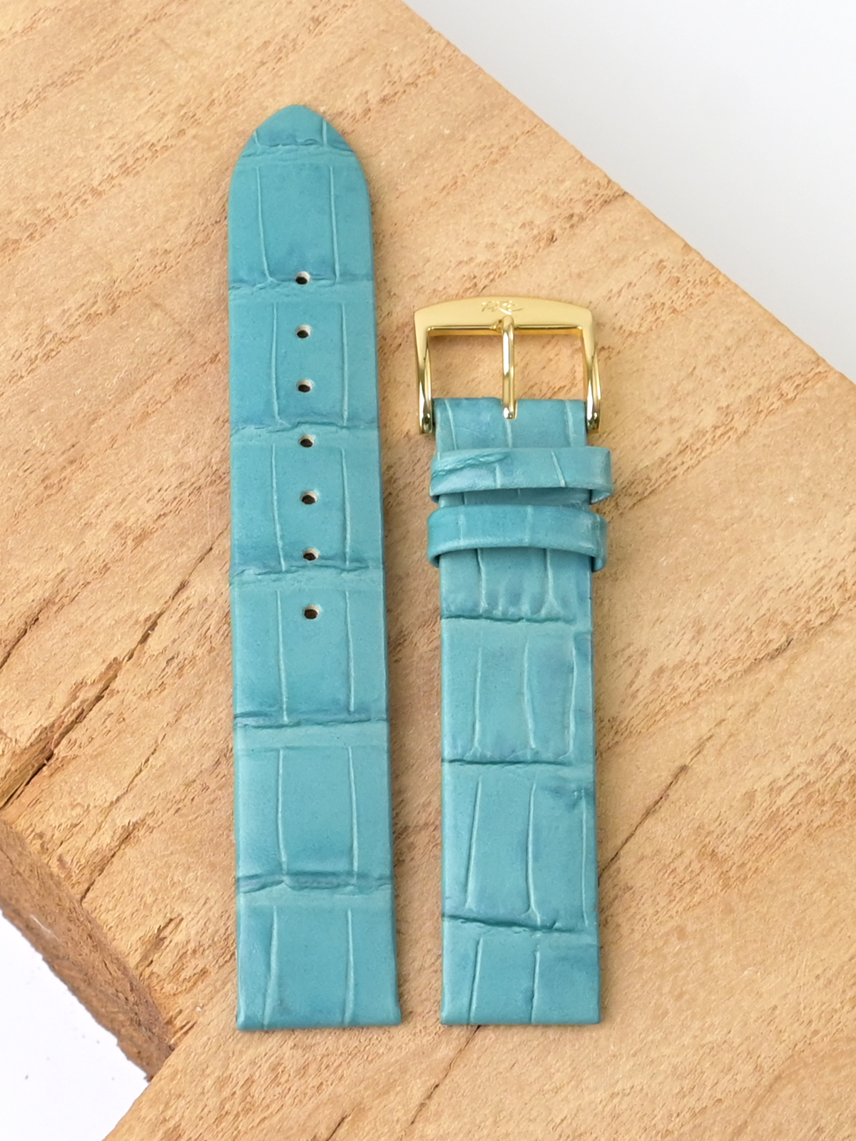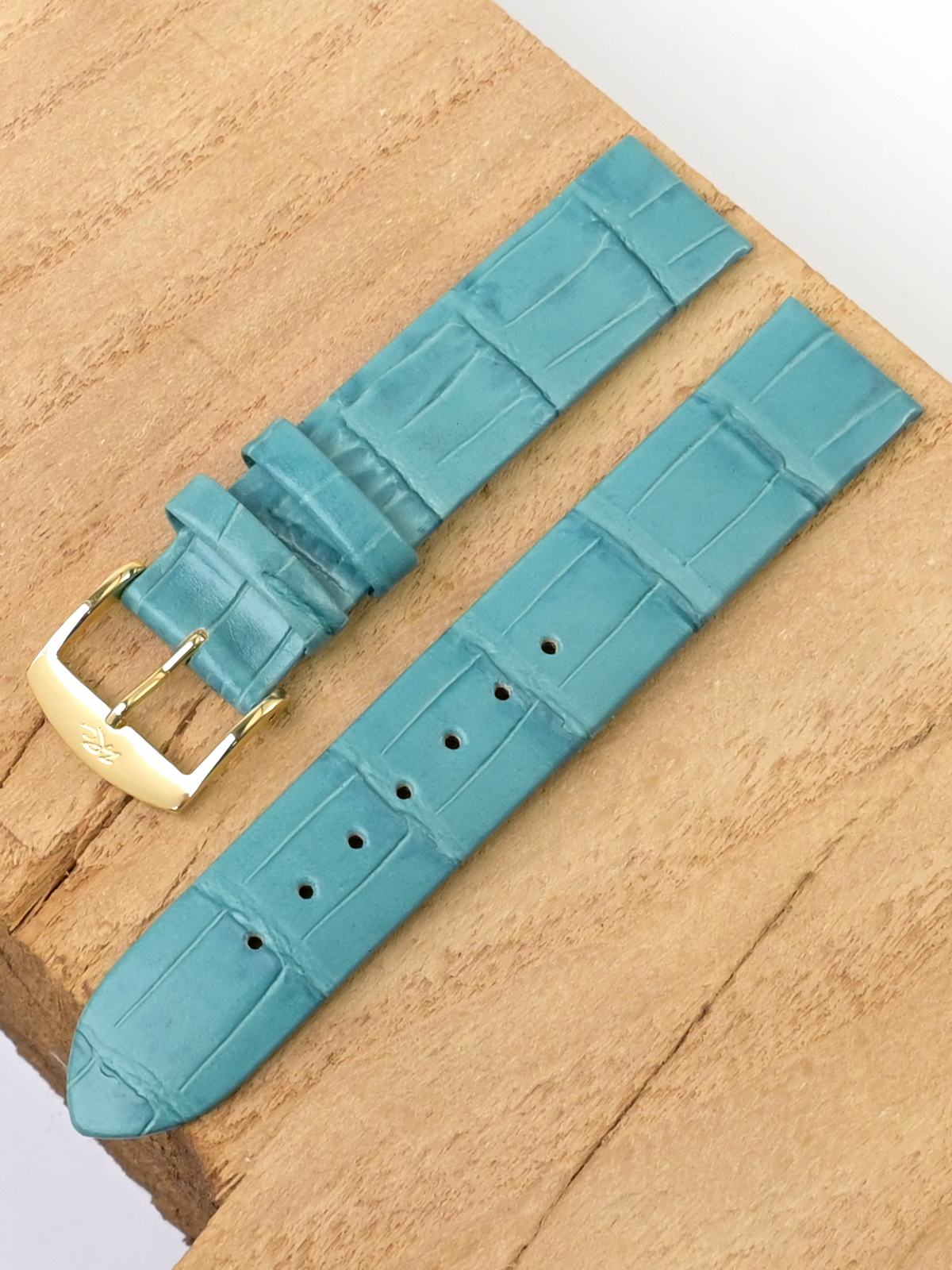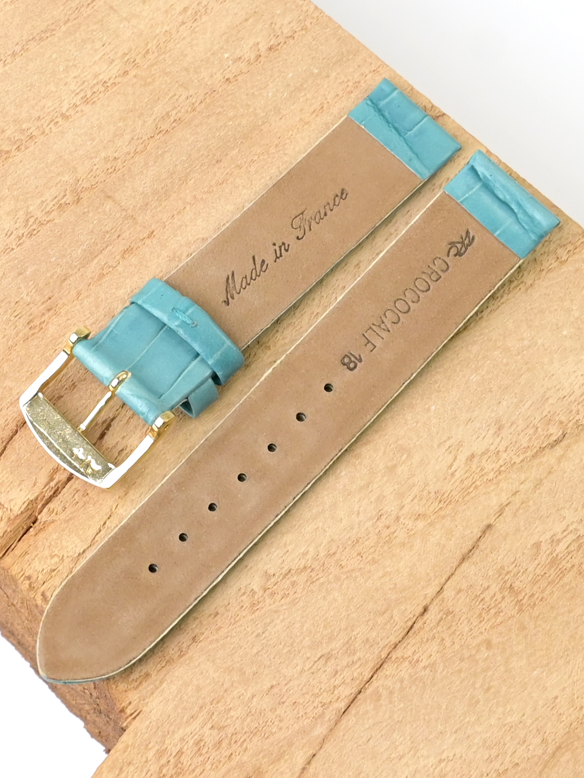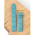 Ремешок из натуральной кожи для наручных часов. Ширина крепления: 18 мм. Ширина пряжки: 18 мм. Длина большей части: 115 мм. Длина меньшей части без застежки: 75 мм. Пряжка выполнены из алюминия с покрытием цвета желтого золота.