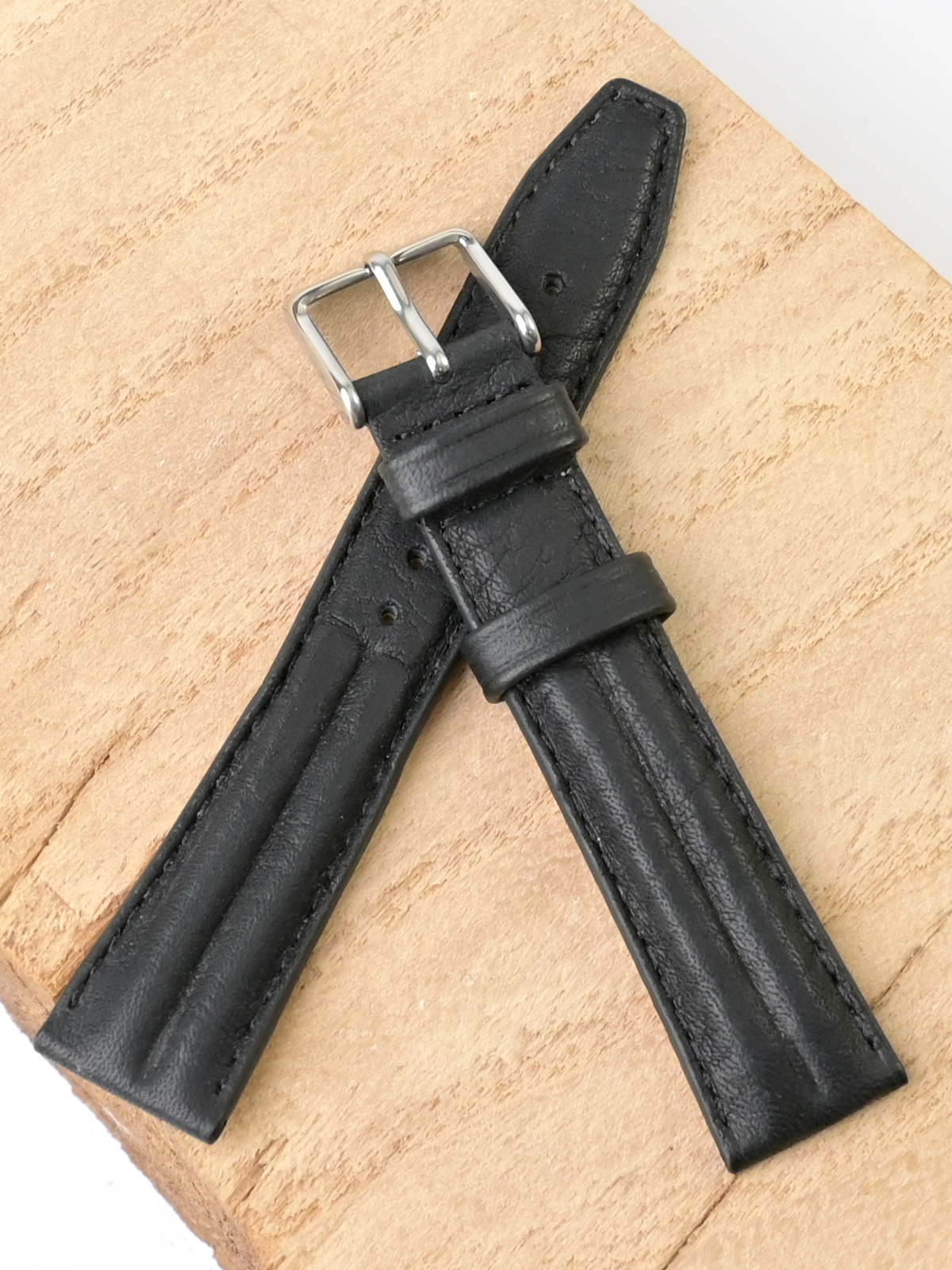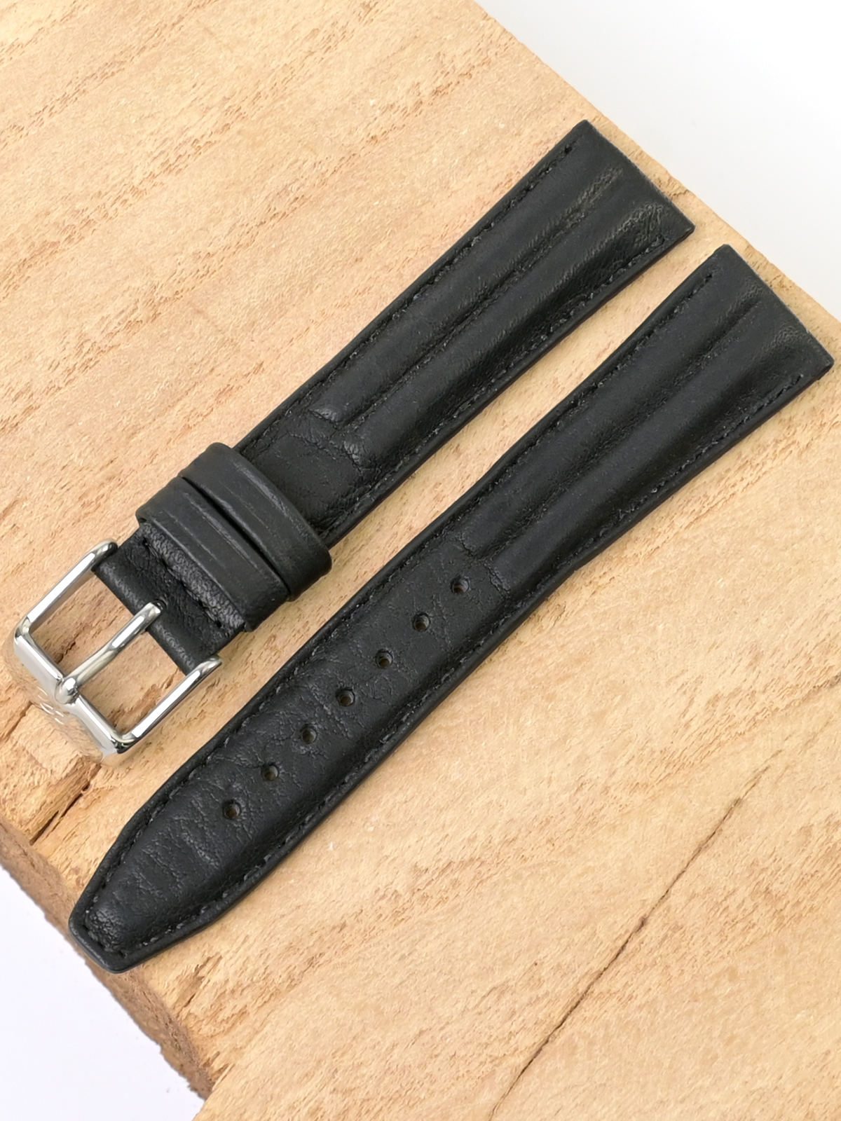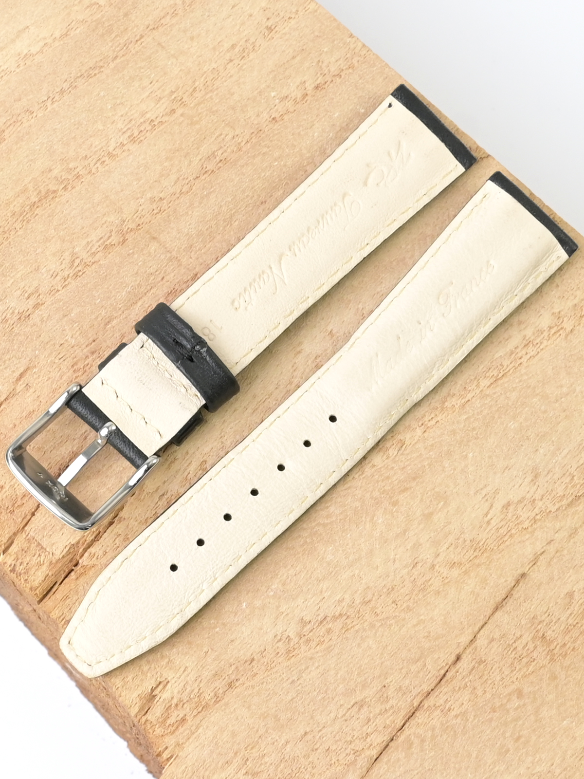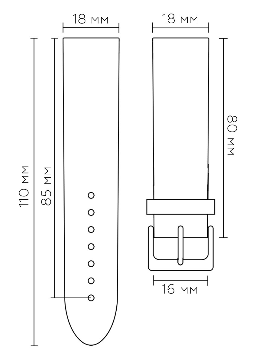 Ремешок из натуральной кожи для наручных часов. Ширина крепления: 18 мм. Ширина пряжки: 16 мм. Длина большей части: 110 мм. Длина меньшей части без застежки: 80 мм. Пряжка выполнена из полированной нержавеющей стали.