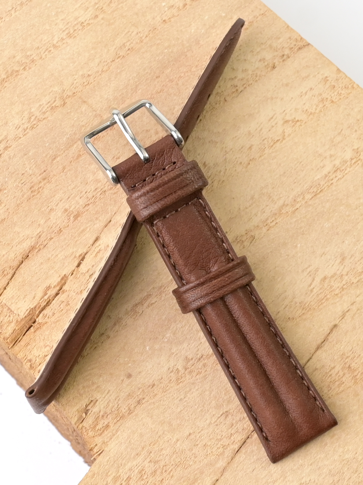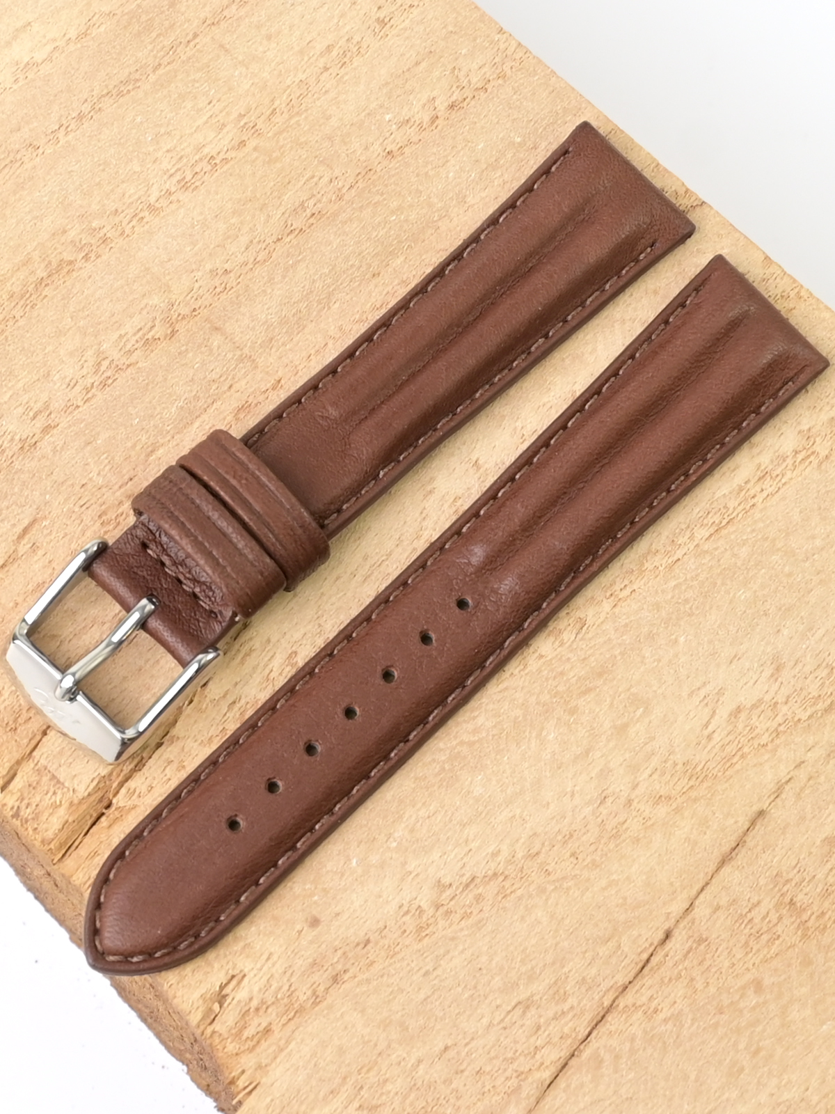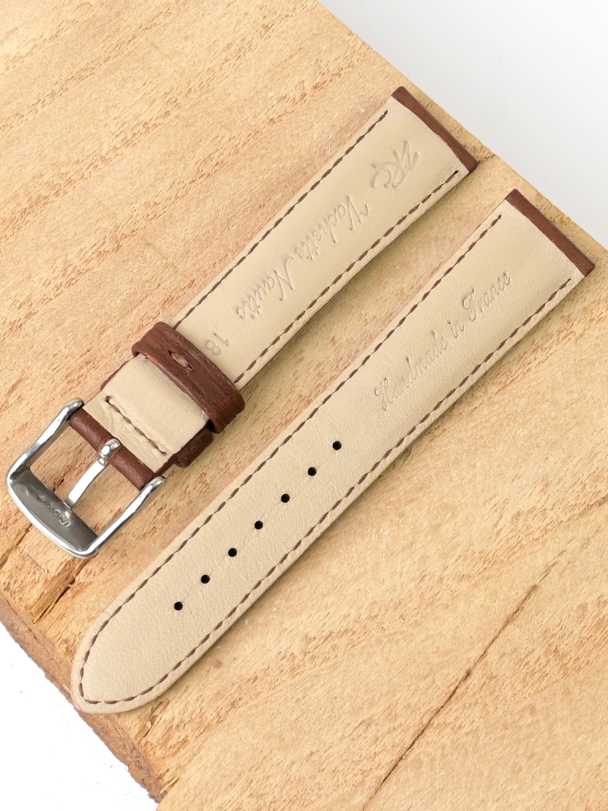 Ремешок из натуральной кожи для наручных часов. Ширина крепления: 18 мм. Ширина пряжки: 16 мм. Длина большей части: 110 мм. Длина меньшей части без застежки: 80 мм. Пряжка выполнены из полированной нержавеющей стали.