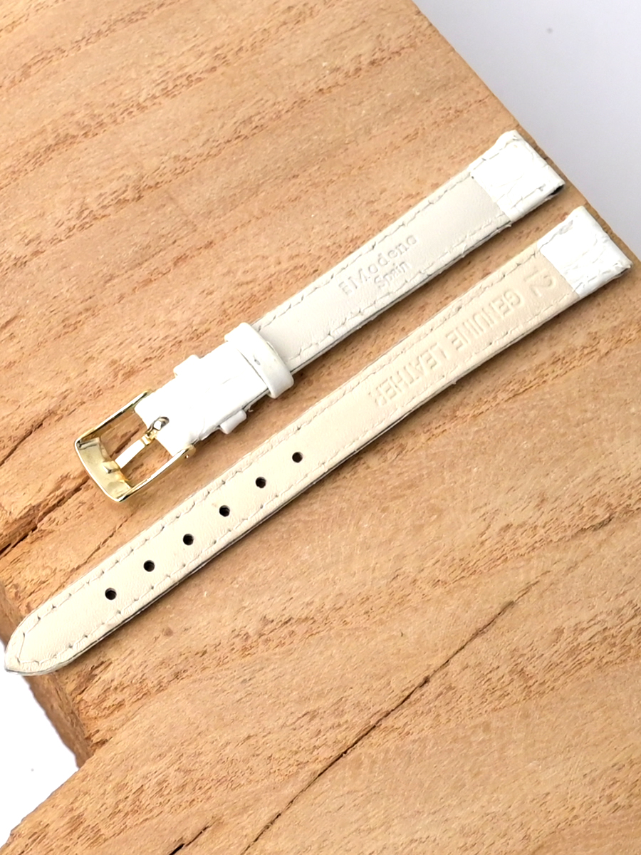 Ремешок Modeno для наручных часов, изготовленный из высококачественной натуральной кожи. Ширина крепления: 12 мм. Ширина пряжки: 10 мм. Длина большей части: 115 мм. Длина меньшей части без застежки: 75 мм. Пряжка из нержавеющей стали с покрытием цвета желтого золота.